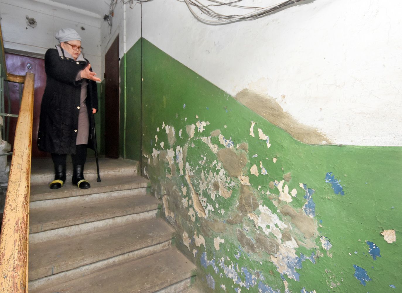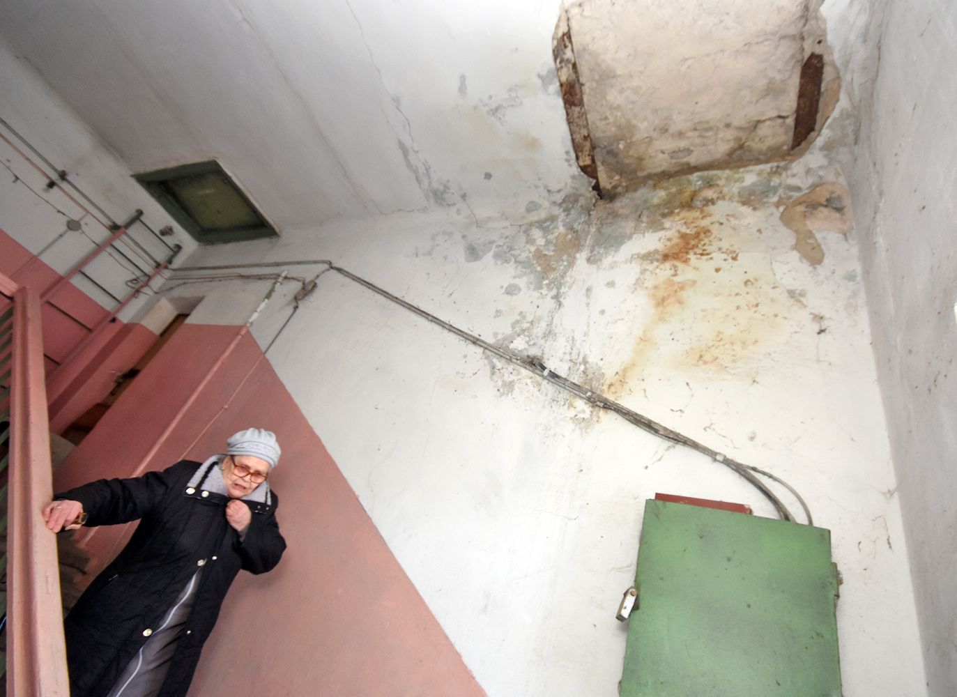 Мы познакомились с жительницей 1-го подъезда, пенсионеркой Светланой Родионовой, которая проживает в доме с 1969 года. Женщина встретила корреспондентов «МОЁ!» оптимистично: «Хорошо, что вы не спускались по нашему подъезду в ночь с 5 на 6 февраля, иначе бы кусок штукатурки точно упал бы на ваши головы». Женщина показала пальцем на потолок подъезда: прямо над нашими головами зияла дыра, из-под которой выглядывала дранка. Большой кусок штукатурки (примерно метр на метр) упал отсюда несколько лет назад, а уголок поменьше (килограммов на пять) свалился в недавнюю февральскую ночь. Почему всё рушится, понятно: дом аварийный, а значит, «безнадёжный», как больной в хосписе, и какая УК будет вкладываться в ремонт того, чего скоро не будет вообще. Впрочем, «скоро» — понятие относительное.