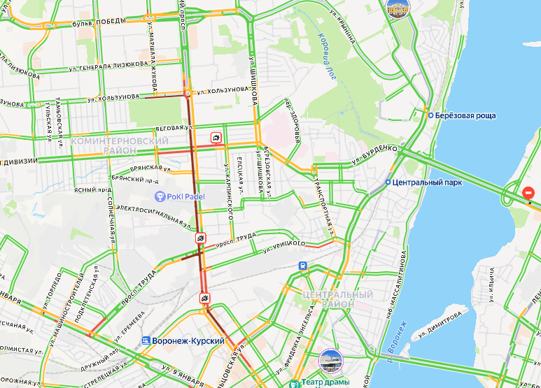 5-километровая пробка сковала Московский проспект в Воронеже, если верить данным сервиса «Яндекс карты».