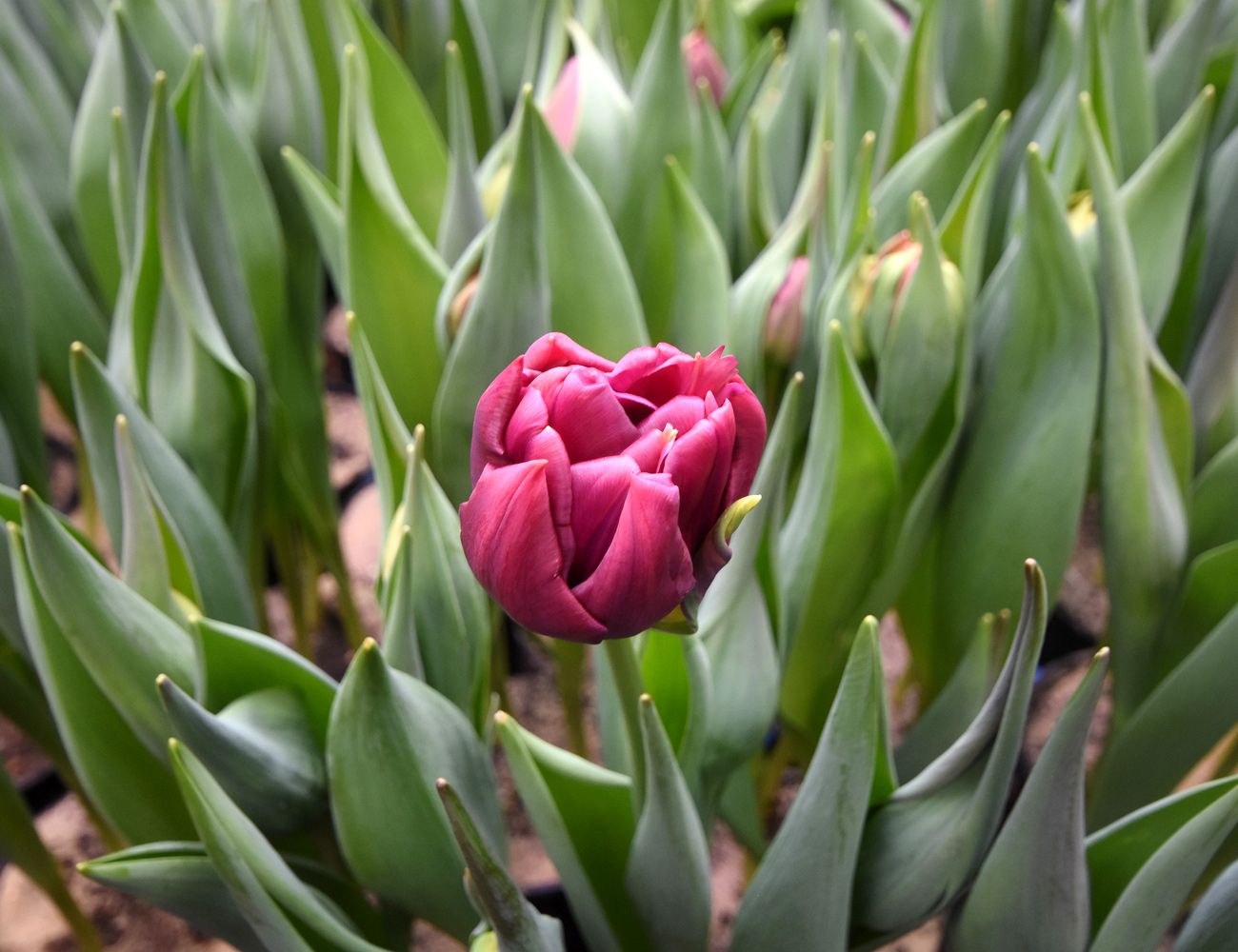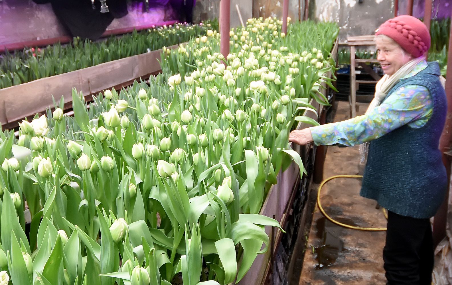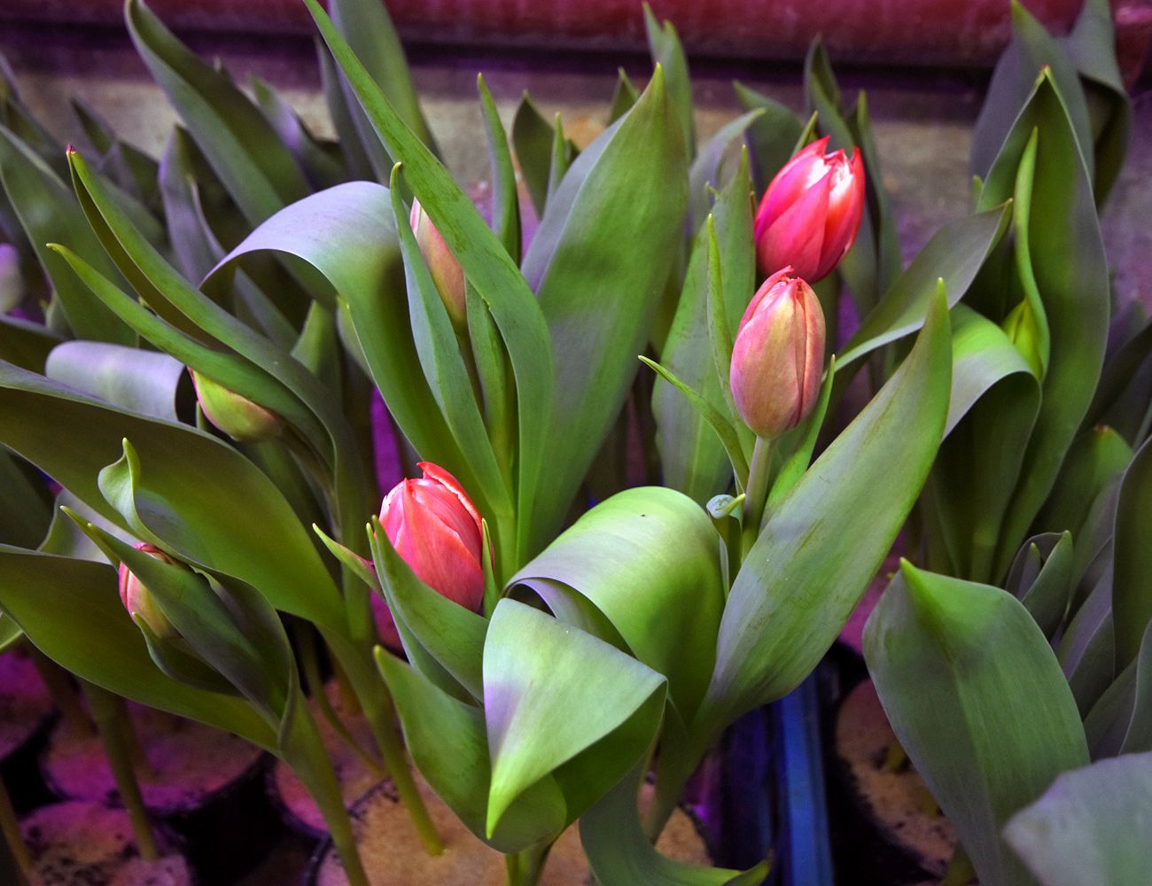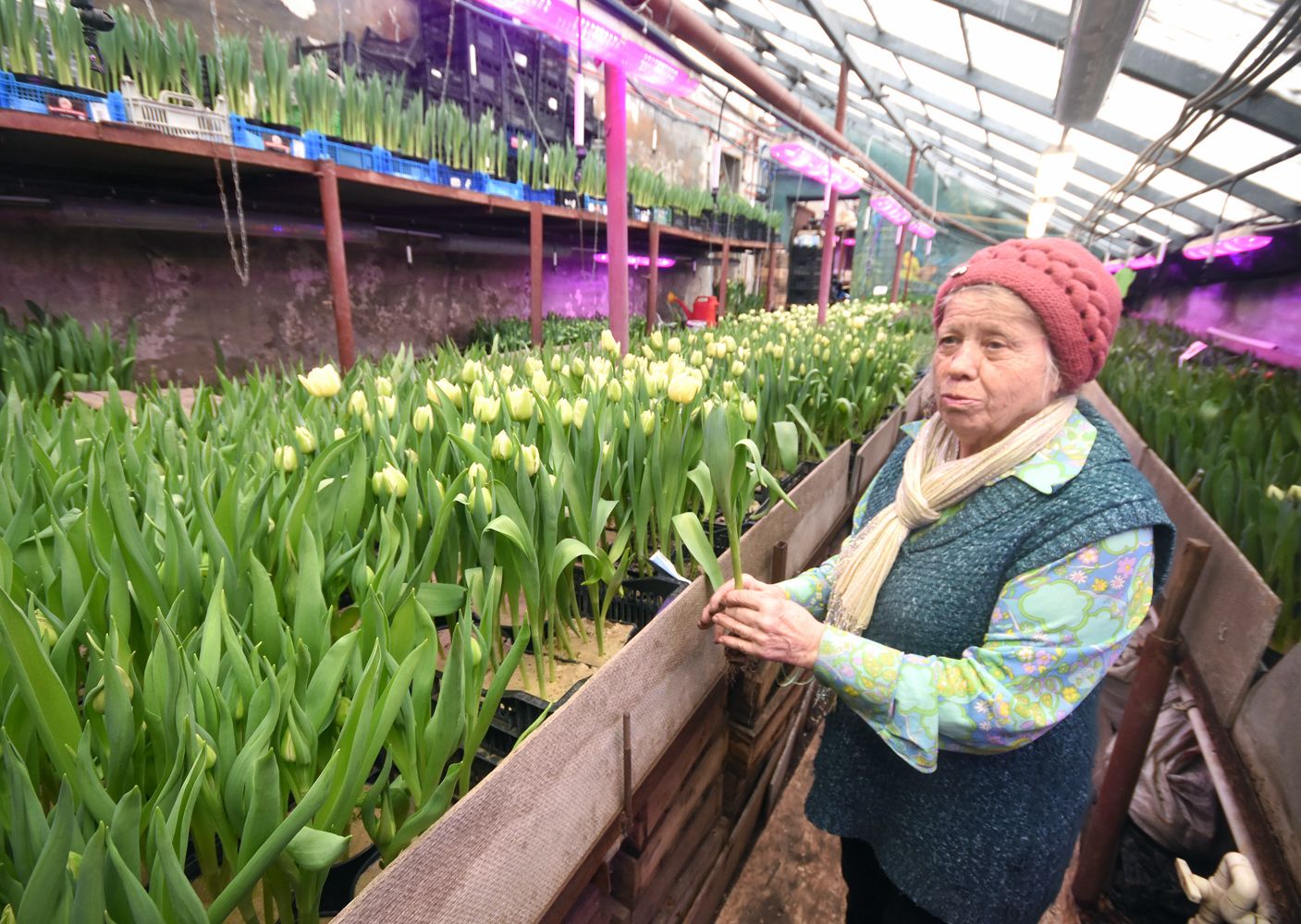 — Посадка тюльпанов идёт в ноябре — декабре, — повела нас вдоль цветочной плантации агроном Любовь Ивановна Симонова. — Зацветут они ровно к 8 Марта, это мы точно знаем. Потому что сами регулируем температуру в теплицах. Чем холоднее, тем медленнее расцветают тюльпаны.