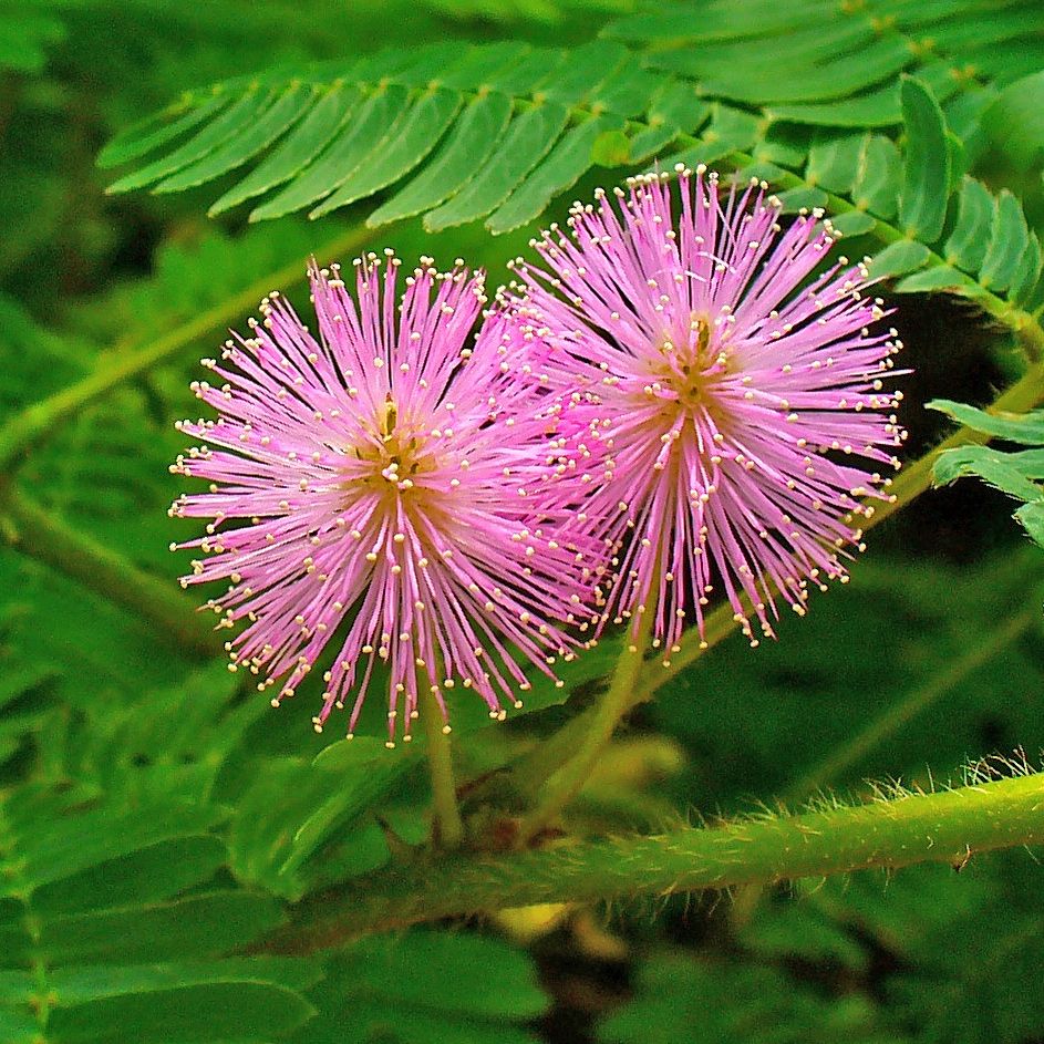 Настоящая мимоза, или мимоза стыдливая (Mimosa pudica), выглядит совершенно по-другому. Её цветки имеют нежный розово-сиреневый оттенок, а листья обладают уникальной способностью складываться при малейшем прикосновении.