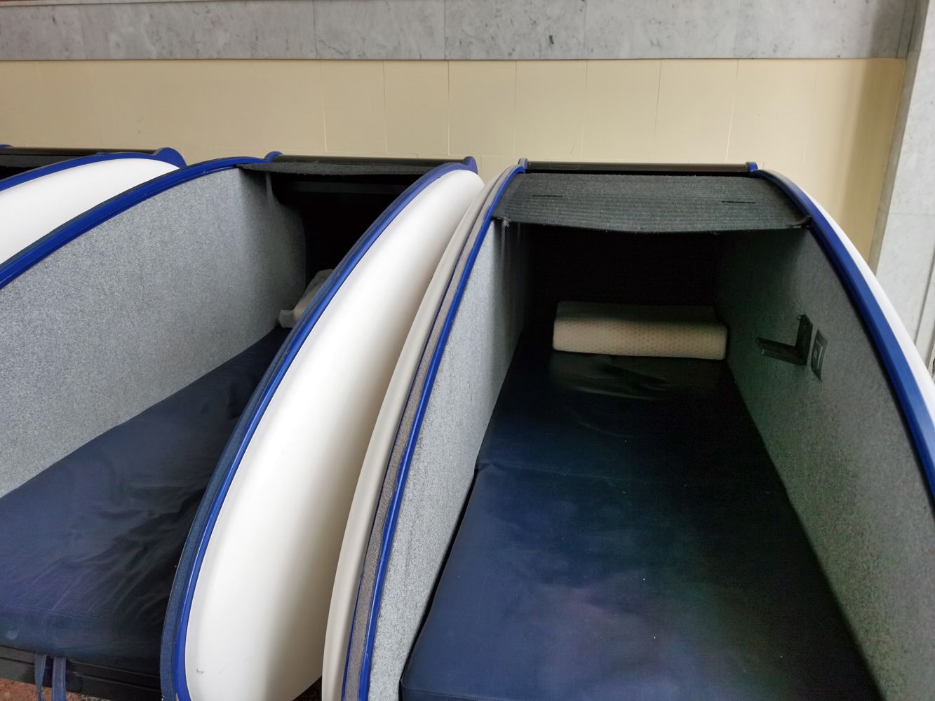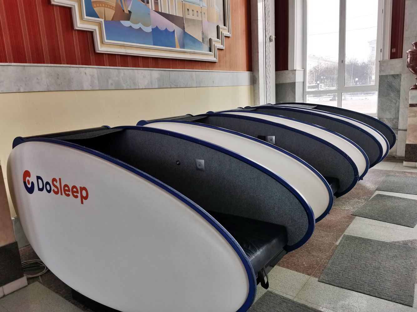 Мы оплатили час отдыха, получили чек и прошли в зал, где в этот момент не было ни души. В помещении вдоль стен были установлены мягкие кресла для желающих отдохнуть в комфортных условиях. А чуть в стороне — четыре капсулы для сна, чем-то напоминающие огромные футляры для очков.