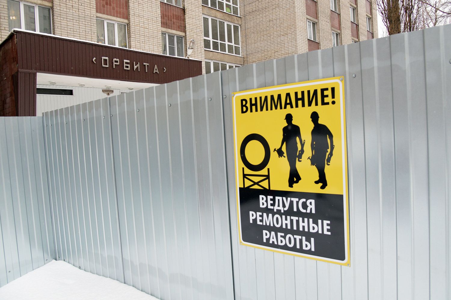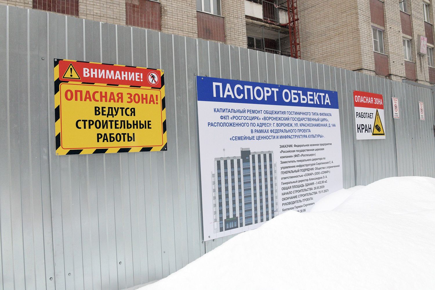 Мы стоим возле общаги, перед входом — информационный аншлаг, анонсирующий капитальный ремонт общежития гостиничного типа филиала ФКП «Росгосцирк» «Воронежский государственный цирк» в рамках федерального проекта «Семейные ценности и инфраструктура культуры». Любопытно, что адрес указан так: ул. Краснознамённая, 14а (непонятно, откуда взялась литера «а»). Ниже — даты: начало работ — 26 мая 2025 года, окончание — 15 ноября 2027-го. Работы уже ведутся.