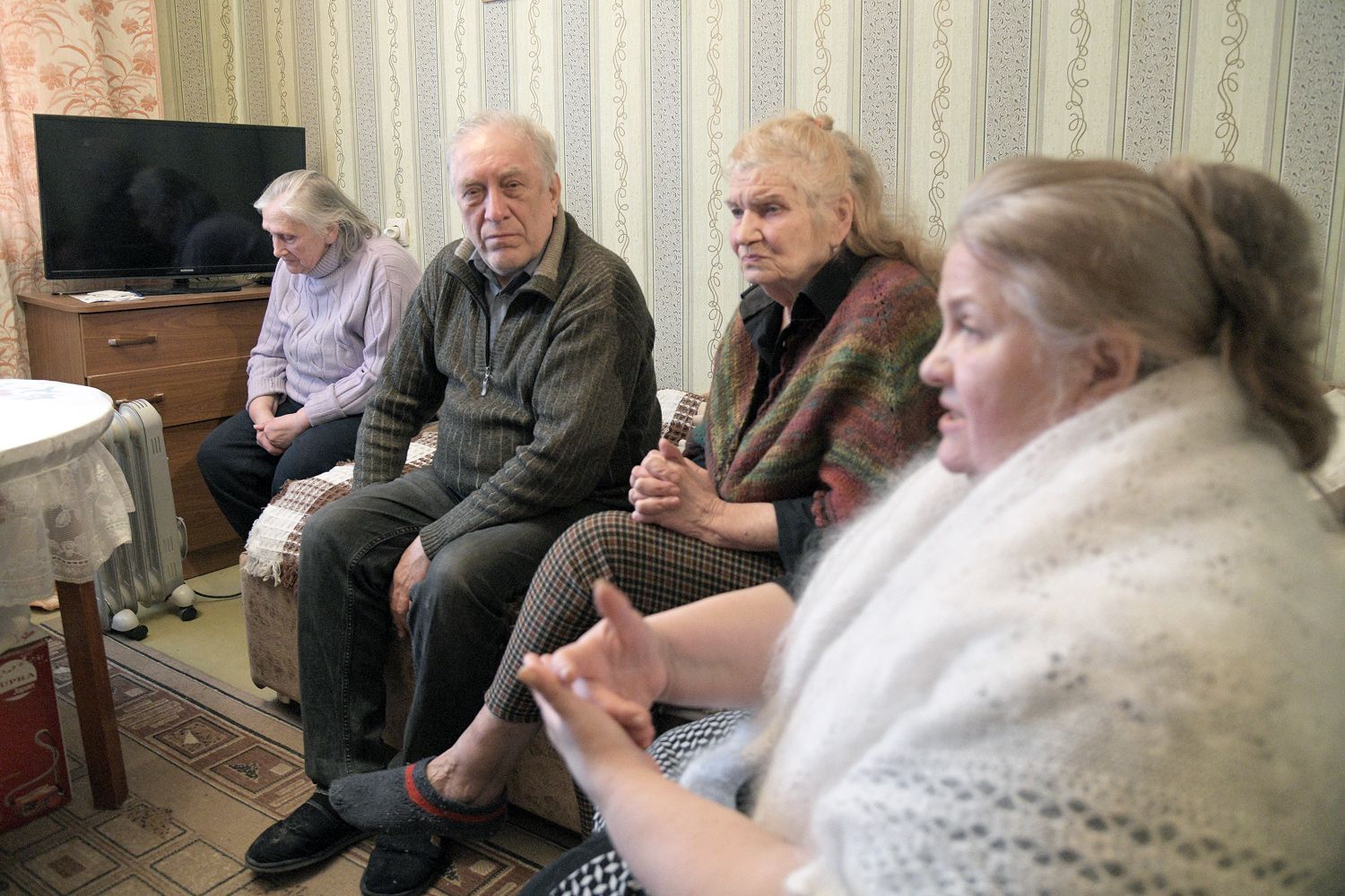 В одной из комнат собрались 70-летняя Раиса Авдеева, 69-летний Виталий Мусихин и другие пенсионеры чуть помоложе — Евдокия Федорищева, Светлана Пенькова, Валерий Балдин.