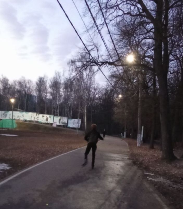 Снимки сделаны вчера, 28 марта. Одновременно размяться вечерком решили роллеры и лыжники. Любители роликовых коньков рассекали по асфальтированной трассе, а почитатели зимних видов спорта облюбовали дорогу в лесу, где до сих пор сохранился снежный покров.