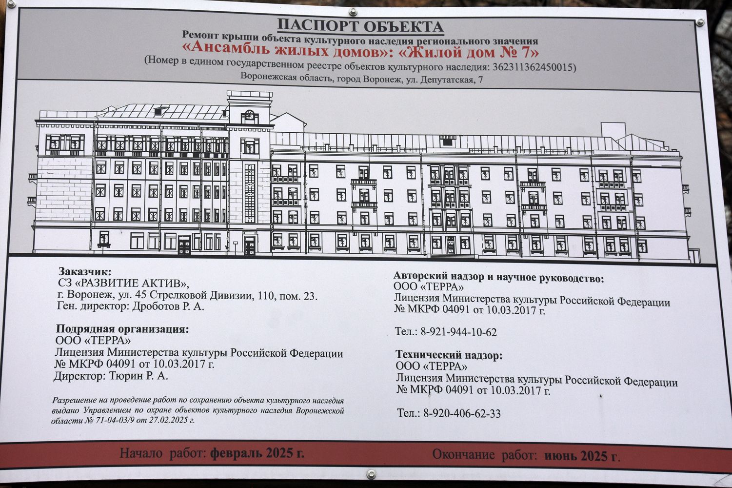 По условиям конкурса, собственник в течение двух лет должен разработать и согласовать с управлением по охране объектов культурного наследия Воронежской области проектную документацию и приступить к восстановлению здания. А завершить работы по ремонту и реставрации дома, согласно тому же документу, он обязан не позднее пяти лет со дня согласования проектной документации с мэрией.