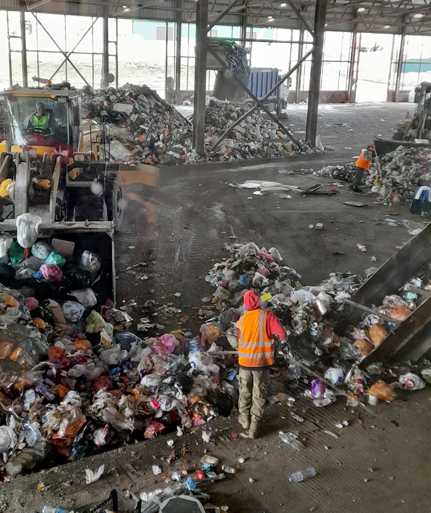 На заводе, как в больнице, нас встретило приёмное отделение. Это официальное название большого ангара, где разгружаются мусоровозы и проходит первый этап сортировки. Из мусора выбирают древесные отходы, мебель, оконные рамы, двери, обрезь деревьев. Они загружаются в самосвал и перемещаются к шрёдеру для измельчения и дальнейшего использования в качестве пересыпки слоёв отходов на полигоне. Здесь же из мусора выбирают так называемые несортируемые отходы — унитазы, раковины, покрышки, детские кресла, бытовую технику.