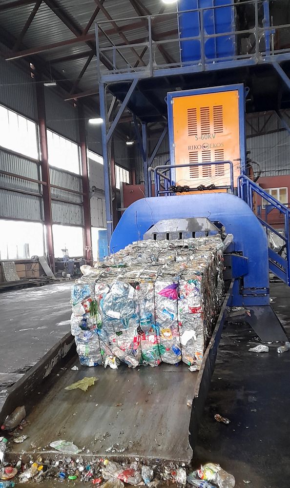 По-хорошему после такой сортировки должны оставаться в основном пластиковые бутылки, металл и картон. И далее отделяют именно их. Причём также преимущественно вручную. Пластиковые бутылки отбирают по видам — от напитков, от молочной продукции и от подсолнечного масла. Металл — в основном это консервные банки — отделяют с помощью магнитного сепаратора. Исключение — алюминиевые банки. Так как магнит не притягивает к себе алюминий, банки также выбирают руками. Далее и металл, и пластик, и картон прессуются и увязываются в брикеты. Оставшиеся на выходе с конвейера отходы заводчане называют «хвостами» — это преимущественно ветошь и мелкий пластик.