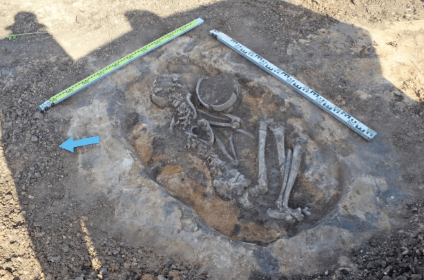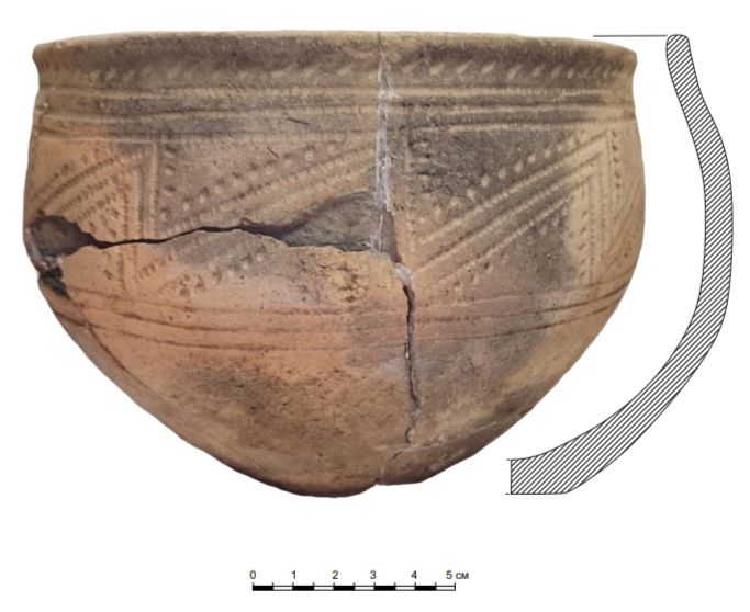В могиле лежали человеческие останки и керамический горшок. Скелет оказался сильно фрагментирован из-за землеройных грызунов. У него нет нескольких рёбер, позвонков, мелких костей рук и ног. Погребённый лежал в скорченной позе.