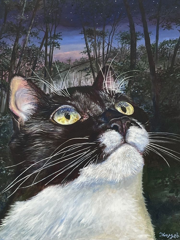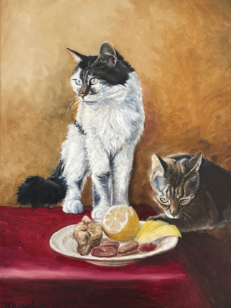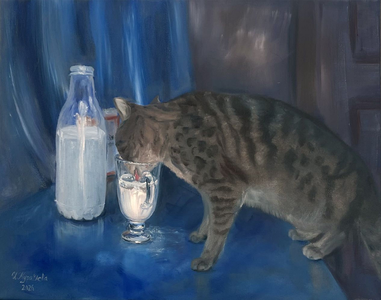 Котики, сидящие на окнах, в творчестве Марии Булавинцевой появились неслучайно: она замечала их, гуляя на улице с ребёнком,. Коты за стеклом вдохновили художницу на целую серию работ. Особенно для Марии дорога картина, на которой изображены её питомцы. В прошлом году одного из них — Семёна — не стало, Мария подарила ему жизнь в акварельных красках.