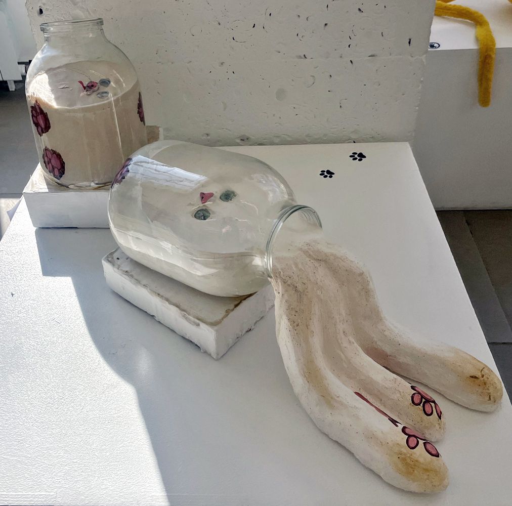А художница Марина Ушакова вдохновилась интернет-мемом «кот — это жидкость». Кстати, такая теория действительно есть, французский учёный Марк-Антуан Фардин даже написал на эту тему работу «О реологии кошек». В своём труде он пытался доказать, что котики, залезающие в сосуд, «растекаются», принимая его форму, и поэтому вполне заслуживают сравнения с жидкостью. За свою работу учёный стал лауреатом Шнобелевской премии (вручается за сомнительные научные достижения). Так вот, Марина Ушакова решила создать инсталляцию, которая отражала бы тезис учёного. Она залила обычные банки гипсом и нарисовала на нём кошачьи мордочки.