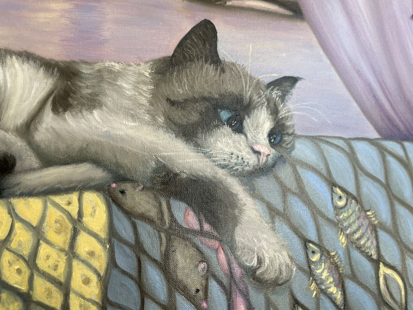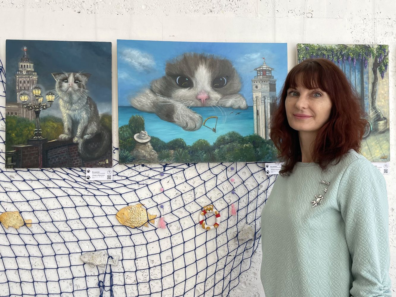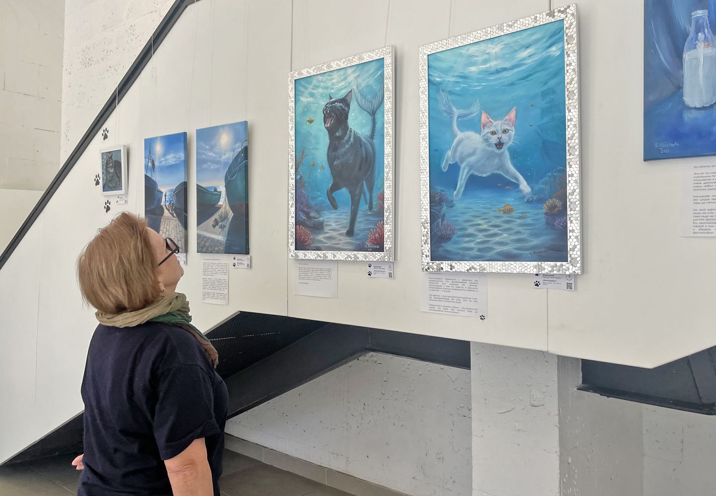 Художница Ирина Журавлёва — маринист. Но на кошачью авантюру всё же согласилась и решила соединить несовместимое: котов и море. Серию картин художница написала в своём авторском стиле. Тут животные с рыбьими хвостами — в подводном мире и на причалах.