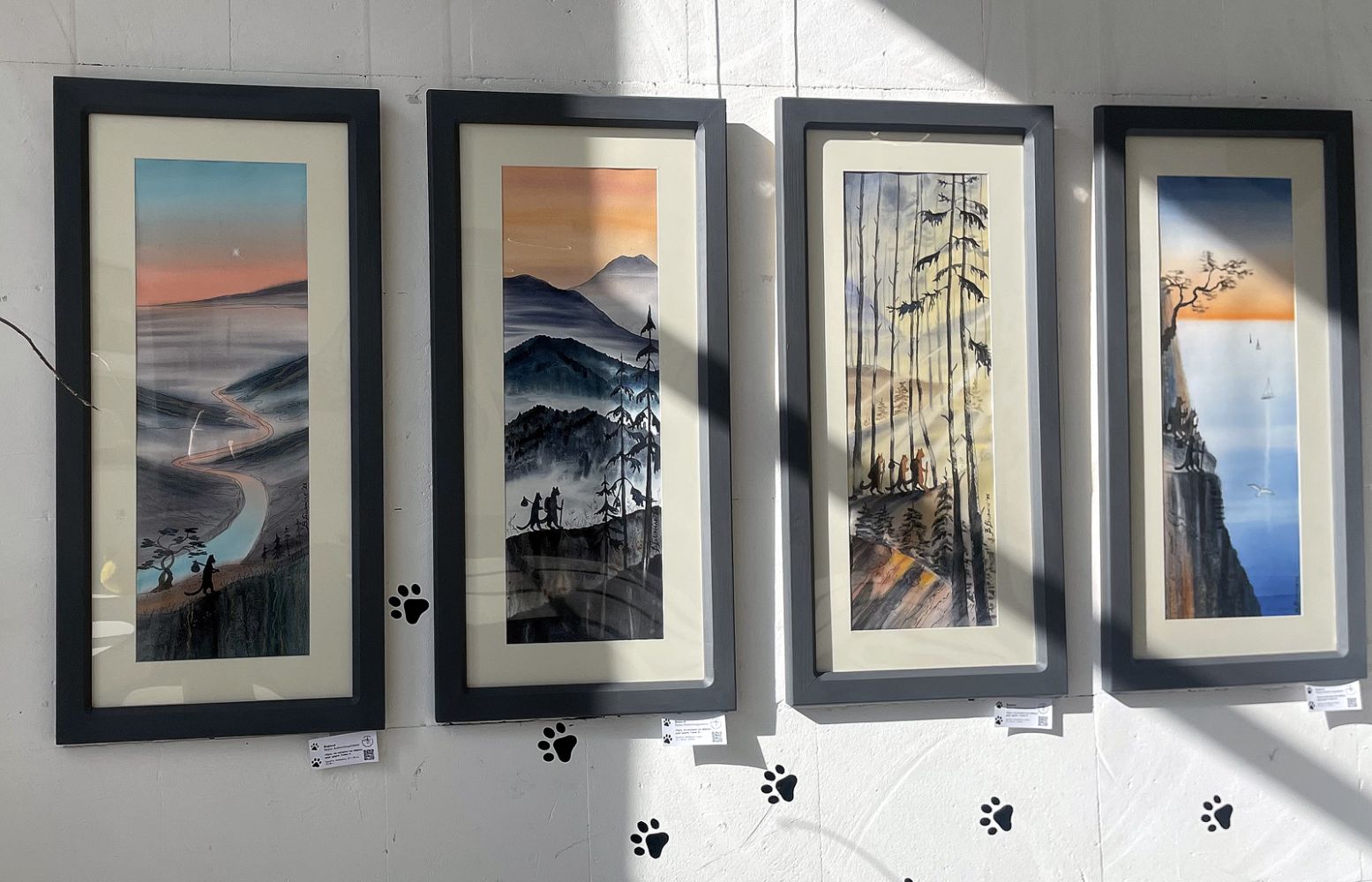 — Я не знала, как подойти к кототеме, — призналась художница. — Рисовать животных — не моё. Хотела отказаться от участия совсем. Но потом в один миг — озарение. И я себе сказала: «Просто рисуй, что любишь». А люблю я горы. Так и родилась серия, а точнее, квадриптих «Путь, на котором мы обрели друг друга».