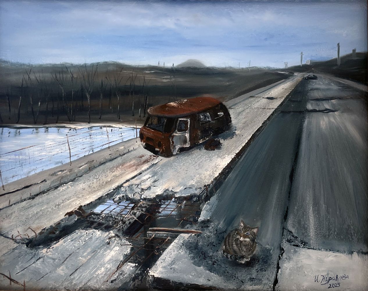 Среди всей кошачьей милоты на выставке есть место и социальным проблемам. Ещё одна картина Ирины Журавлёвой «Мост» из серии «Донбасс» рассказывает о брошенных домашних питомцах. За основу художница взяла кадры с местными полудикими котами, которые после эвакуации хозяев пытаются выживать. Их подкармливают строители, солдаты и те немногочисленные местные жители, которые остались в своих домах.