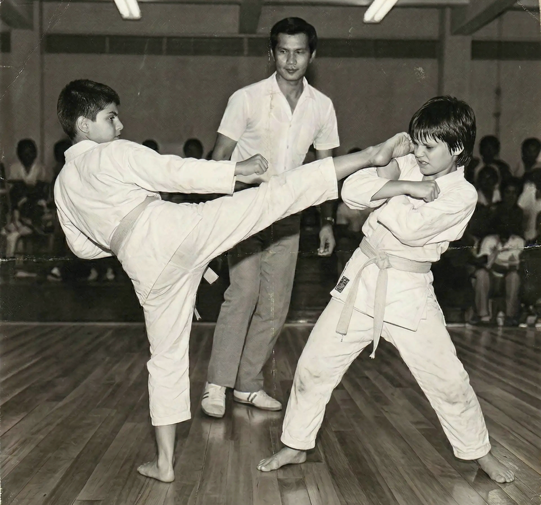 Занимались в спортзале. Безо всяких мягких матов. Кувыркались, падали, отжимались прямо на деревянном полу. Физические нагрузки выматывали. Но нам нравилось. Всеобщее восхищение вызывал тренер Олег. Хотя в каких-то ситуациях он, недавно вернувшийся из армии, свирепел и выглядел страшно. Но авторитетом среди своих учеников пользовался непререкаемым.