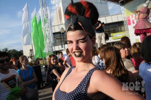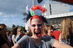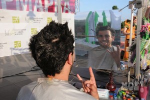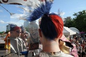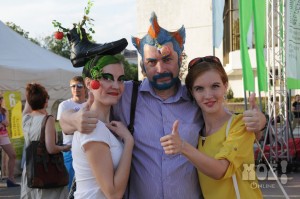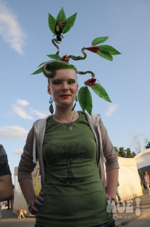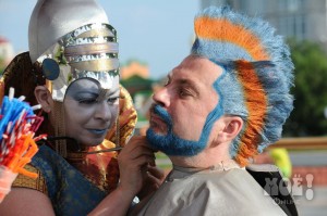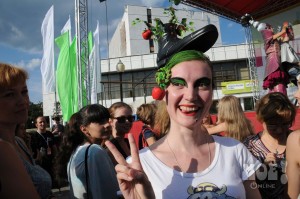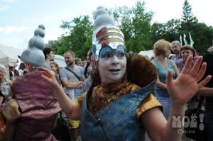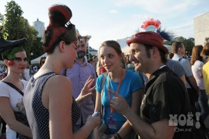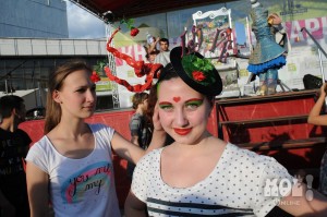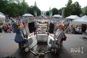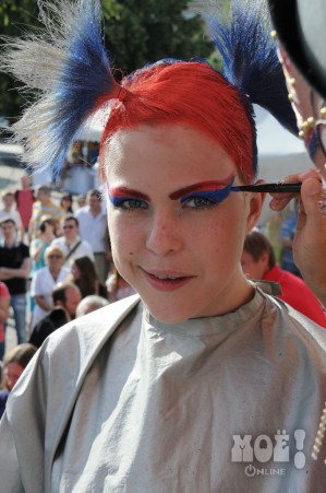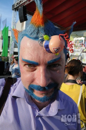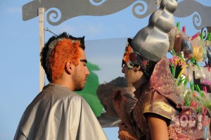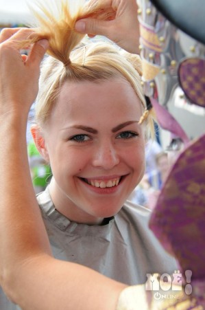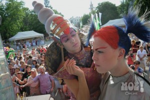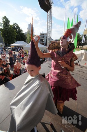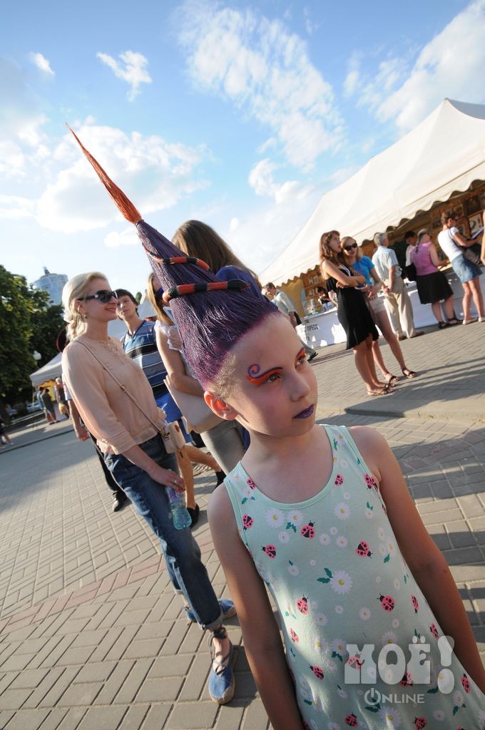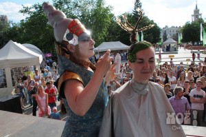 А некоторых посетителей ярмарки ожидал и такой сюрприз: идёшь себе, никого не трогаешь, как вдруг тебя сзади кто-то тихонько дёргает за волосы. Оборачиваешься — стоит причудливо одетый и раскрашенный человек и жестом манит на сцену. Те, кто соглашался, становились посетителями импровизированной парикмахерской, работавшей на сцене, — разумеется, совершенно бесплатно. Прямо на глазах у посетителей минут за 15 - 20 под бодрую музыку «цирюльники» сооружали у них на голове причудливые ирокезы, цветочные композиции и какие-то совсем невообразимые натюрморты — кому-то, например, могли прикрепить к причёске… башмак. Лица тоже раскрашивались под стать головным украшениям.