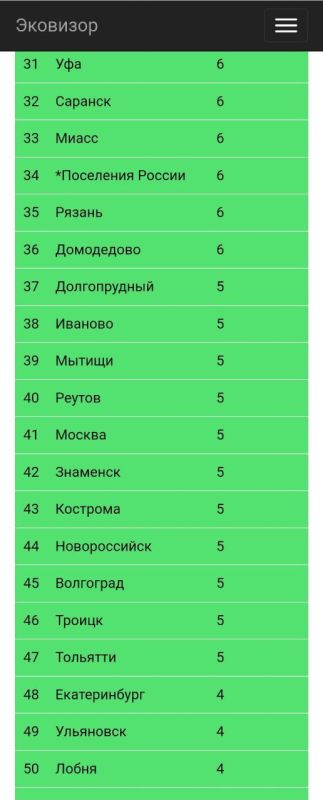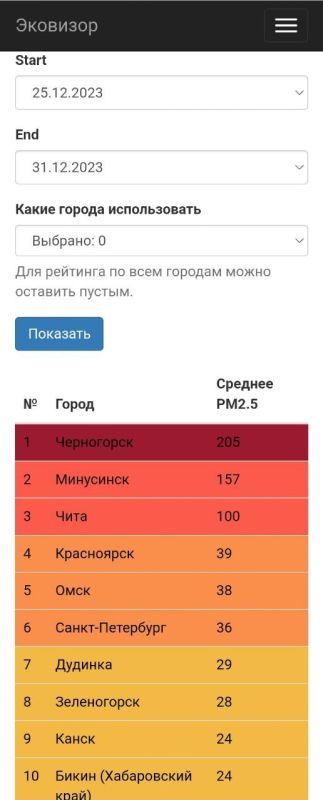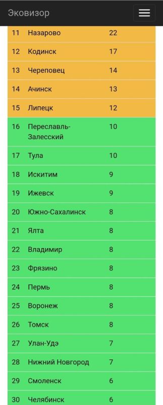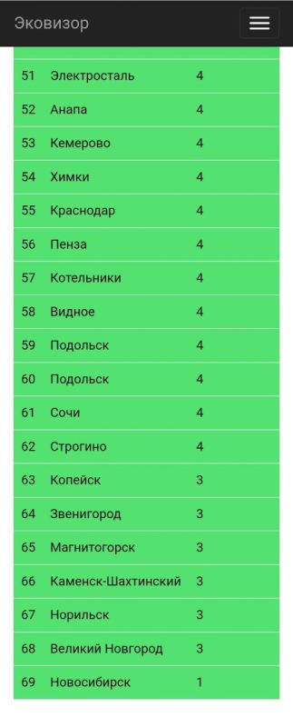 Городами с самым плохим воздухом (бордовая и красная зоны) оказались Черногорск, Минусинск и Чита. Воронеж расположился в зелёной зоне — на 25 месте. Воздух в Москве оказался чище — столица расположилась на 41 месте.