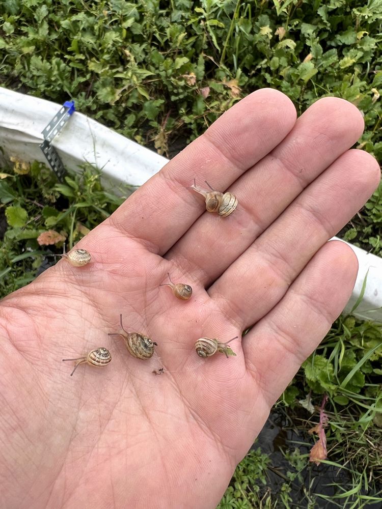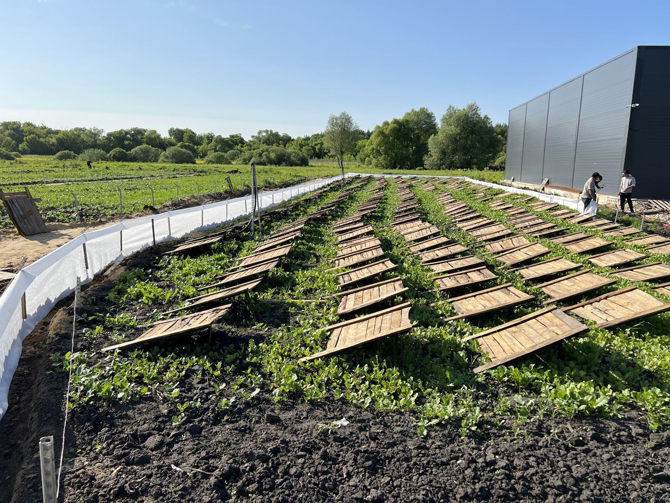 Чтобы увидеть щиты, под которыми живут улитки, мне приходится подходить к ним вплотную и вглядываться в заросли перко — гибрида пекинской капусты и сурепицы, которую они с удовольствием поедают. Сергей поднимает щит и показывает «урожай» в виде десятков коричневых улиток. «Это небольшие, им ещё нужно расти, а вот там, — он показывает рукой вдаль, — уже подросшие». Улитки везде — под щитом, на земле, они висят на траве и дырявят листья своими 25 тысячами зубов. Кроме кормовой травы улитки едят специальный комбикорм, который для них делают на заказ. Сергей признаётся, что нужная по составу рецептура корма получилась аж с девятого раза, хотя многие не гнушаются кормить улиток мелом — от такой пищи их панцирь становится толще, а значит, улитка при продаже имеет больший вес. Такой своеобразный способ заработать — продать меньшее количество за большую цену — Сергею не по душе.