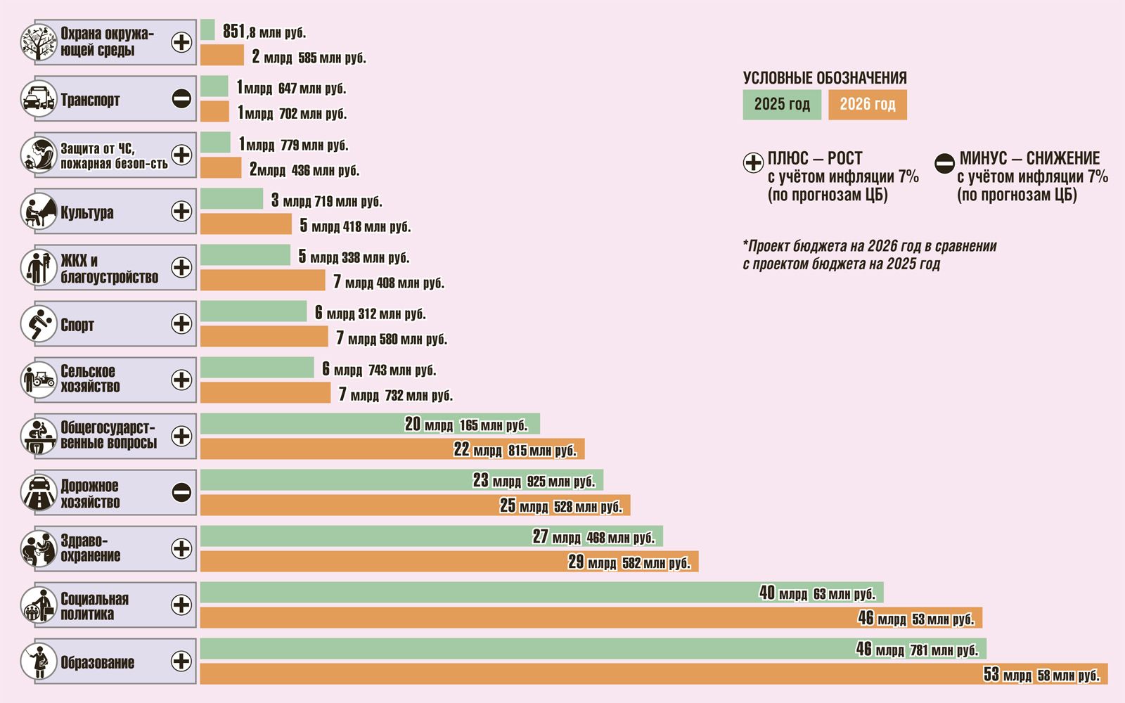 | Сфера | 2024 год (млрд руб.) | 2025 год (млрд руб.) | Разница с учётом инфляции 8% (по прогнозам ЦБ) |