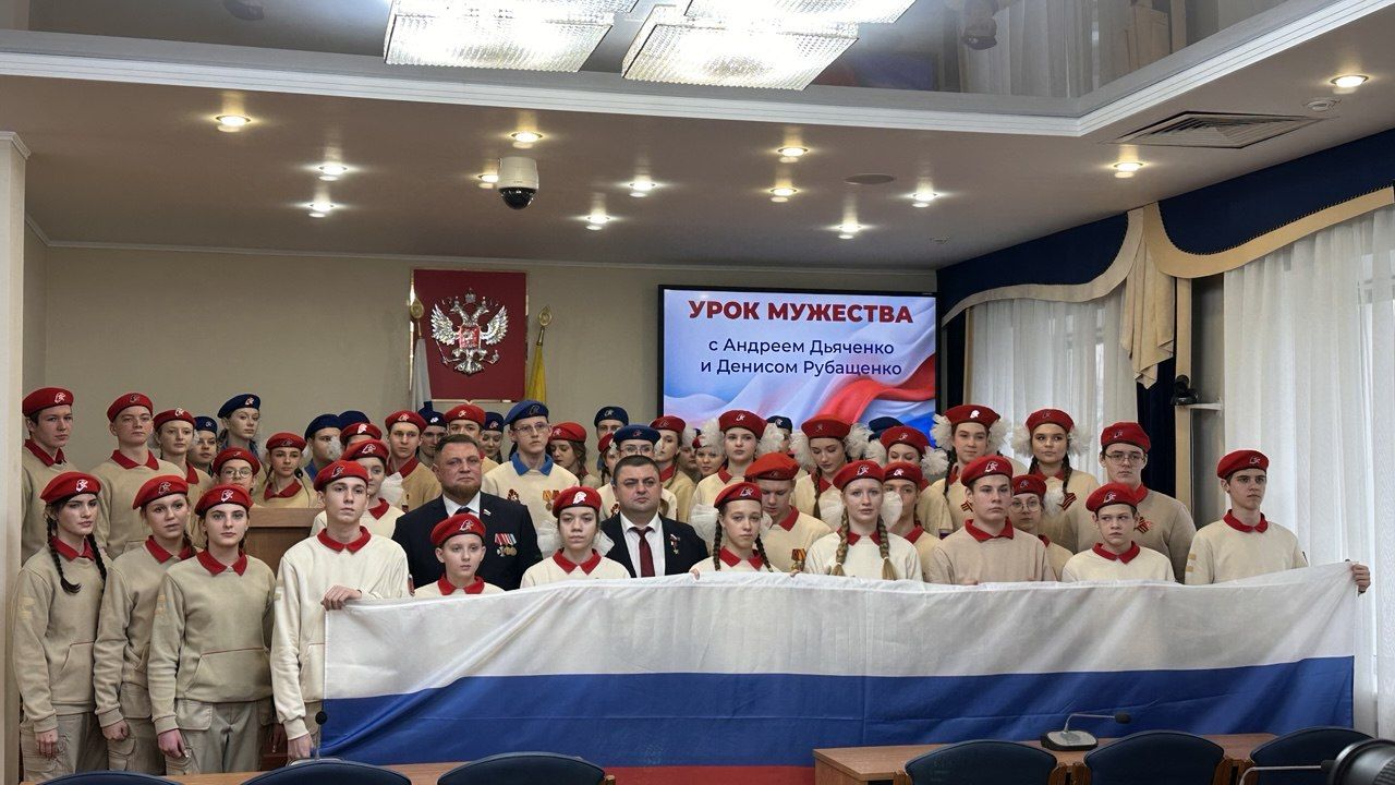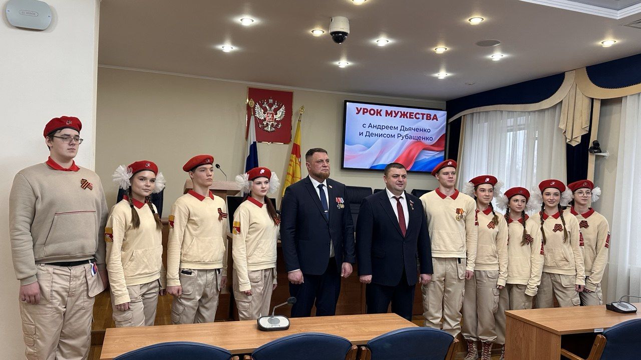 «Урок мужества» для ребят провели председатель городского парламента и Герой России Андрей Дьяченко и депутат областной Думы и участник СВО Денис Рубащенко