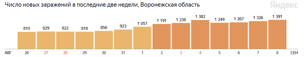 1 391 заболевшего ковидом зафиксировали в Воронежской области за последние сутки. Об этом сообщает федеральный оперштаб сегодня, 8 сентября. Количество заболевших в регионе растёт третий день.