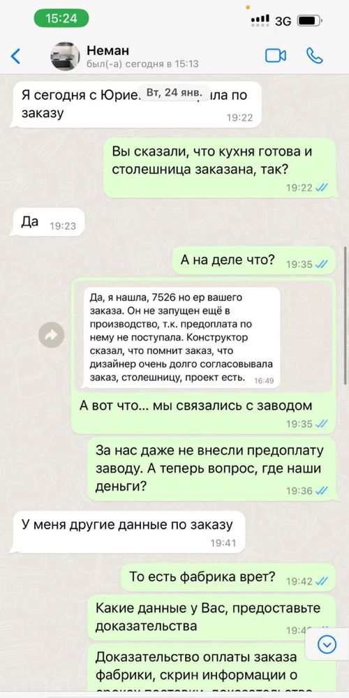 У меня фото с экрана телефона с перепиской Ольги Дайнеко с «Евро Домом»: «Вы сказали, что кухня готова?» — «Да»... А Оля кидает в ответ сообщение с фабрики «Неман», что «заказ не запущен в производство, потому что не внесена предоплата».