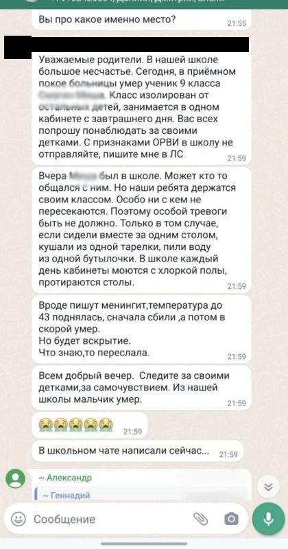 Предположительно причиной смерти школьника стал менингит, но официального подтверждения пока нет. Полякова пояснила, что сначала у ребёнка поднялась температура до 43 градусов. Её удалось сбить, но состояние пациента не улучшилось.