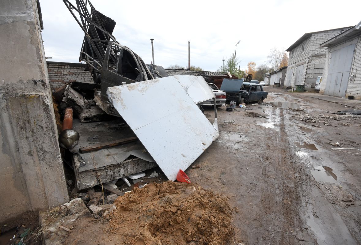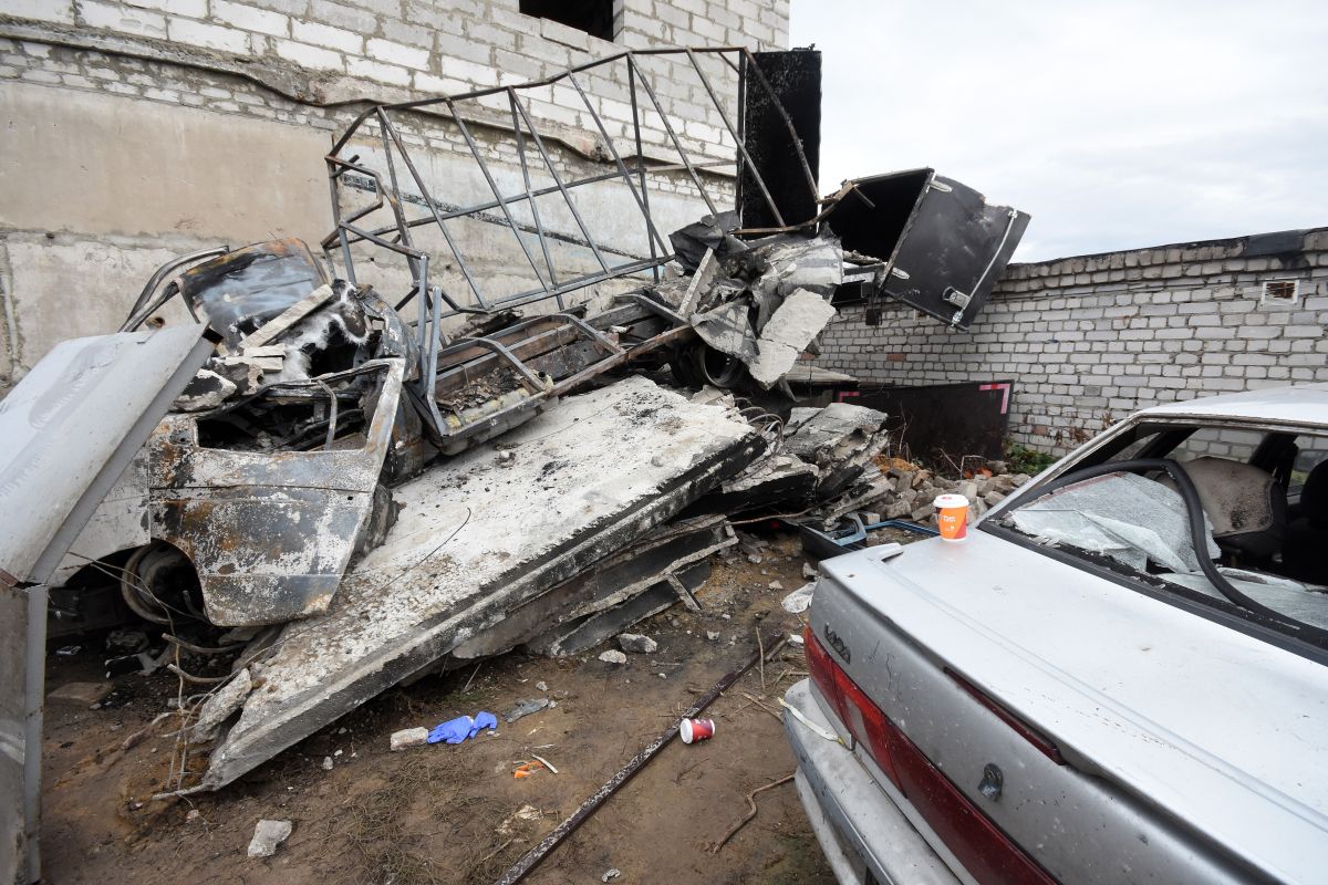 Журналисты «МОЁ!» побывали на месте ЧП на следующее утро, 27 октября. На месте взрыва — руины. Почерневшие кирпичи, груда обломков, никакой крыши. Злосчастная «ГАЗель» стоит рядом, а её обгоревшие останки торчат в метрах десяти, накрытые покорёженной частью ворот. Тут же — несколько обгоревших и помятых машин. Запах гари и лужи — следы тушения.