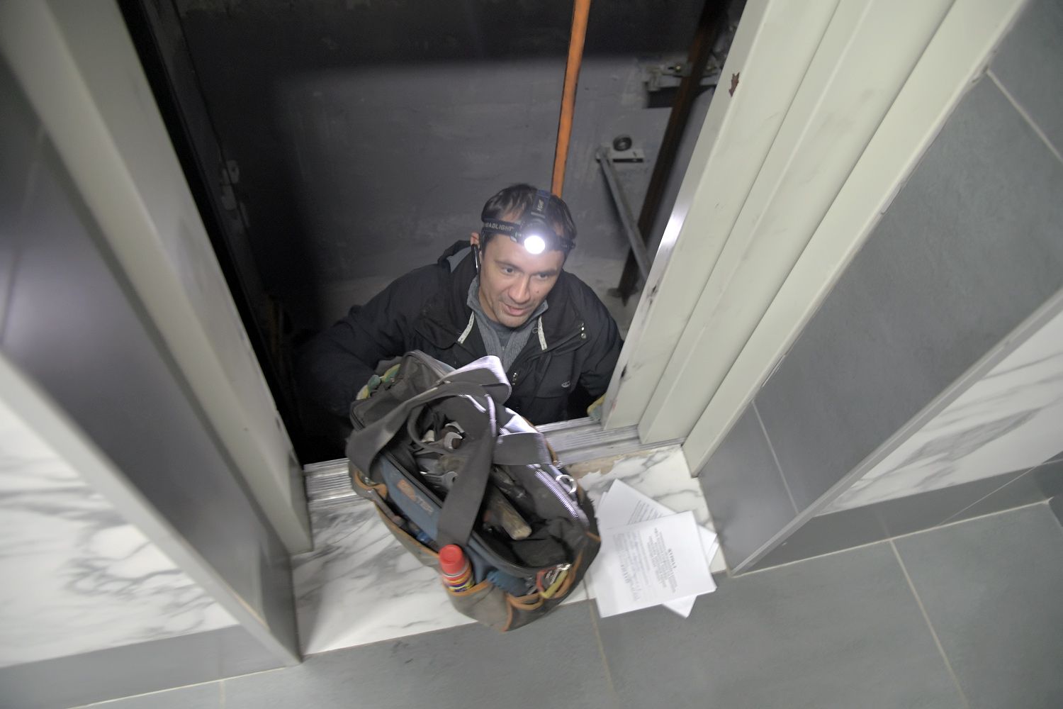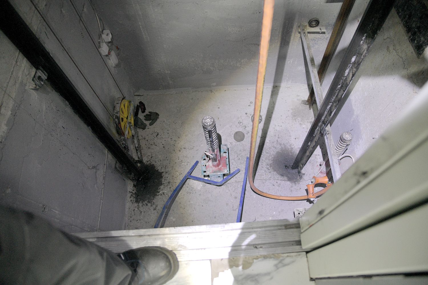 Злополучный лифт в понедельник в середине дня, когда там оказались журналисты «Ё!», ремонтировали. Рабочий с фонариком на лбу копался в шахте лифта.