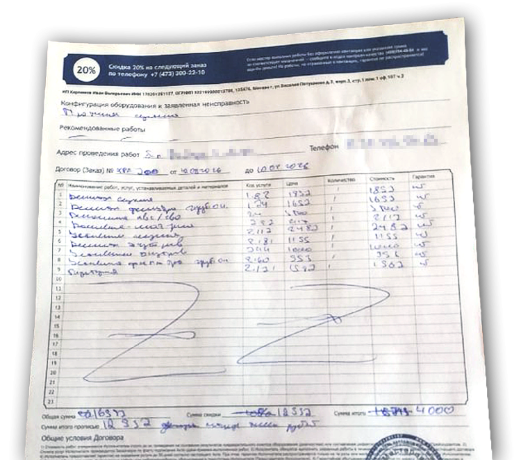 Неразборчивым почерком мастер в столбик выписал все работы, которые он якобы провёл за 20 минут, к каждой из этих работ приписал ценник согласно некому «прейскуранту». Получилось чуть больше 15 тысяч рублей.