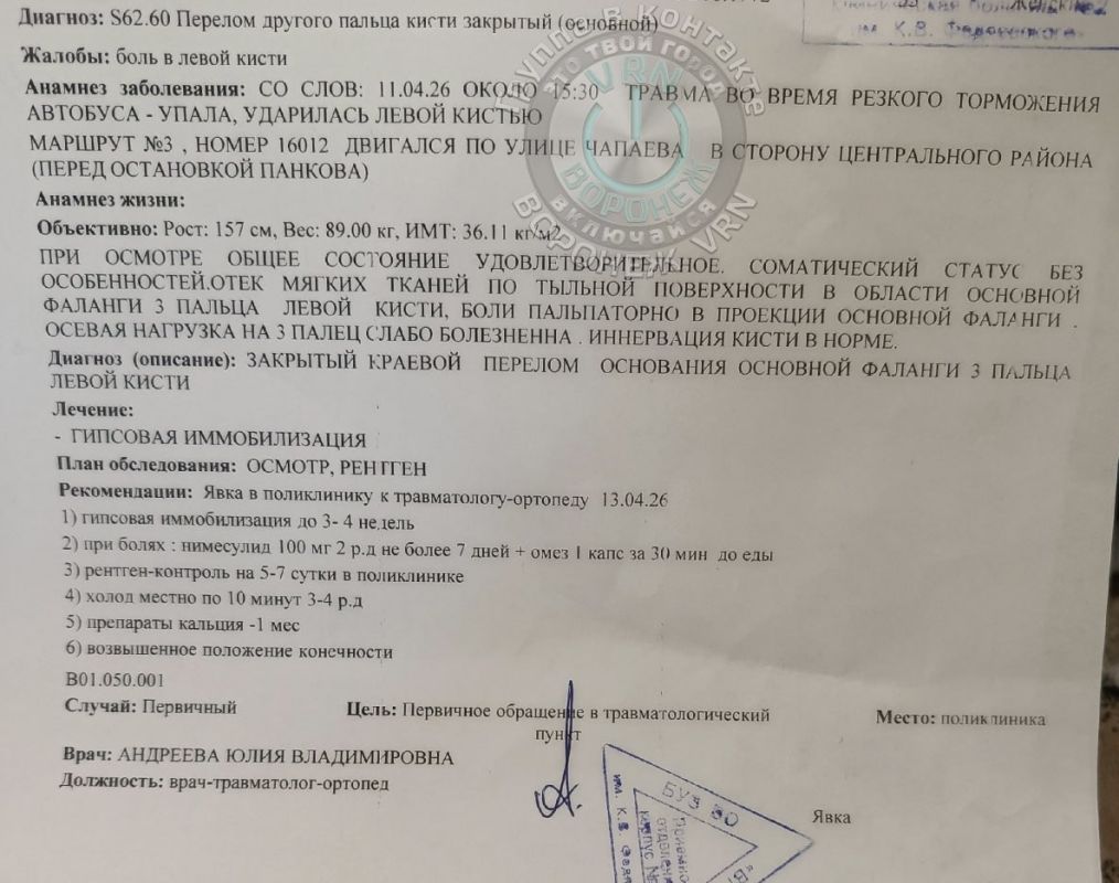 Воронежанка заявила, что пострадала во время поездки на автобусе № 3. Информация о случившемся появилась в соцсетях.