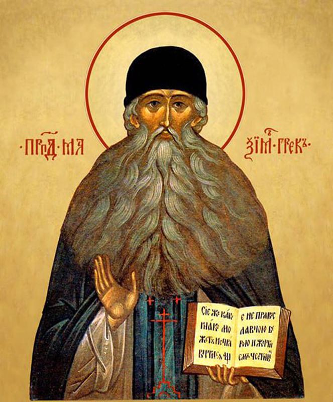 В миру святой, грек с о. Корфу, носил имя Михаил Триволис. Блестящий европейский гуманист. Учился в Италии, общался с великими мыслителями, но, разочаровавшись в светской учености, принял постриг на Афоне. В 1518 году по просьбе князя Василия III он прибыл в Москву как переводчик и исправитель богослужебных книг. Его критика ошибок в книгах и некоторые политические взгляды были восприняты как крамола. Был обвинен в ереси, порче книг и «недоброжелательстве» к великому князю. Более 20 лет максим Грек провел в тяжелейшем заточении в монастырях. Лишенный причастия, книг, в суровых условиях он не сломался. Именно в тюрьме расцвел его литературный талант: он создал множество сочинений-богословские, нравоучительные, лингвистические тексты, полные кротости и мудрости. Его уважали даже гонители.