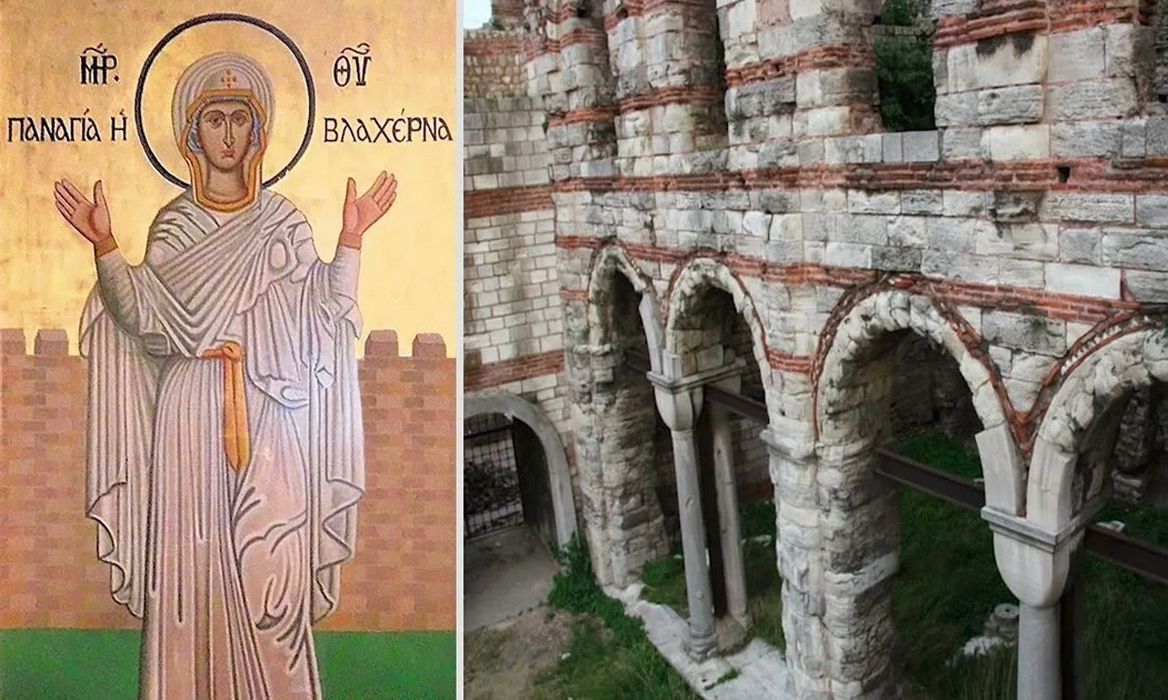 …Жители Константинополя знали, что завоеватели уже на подходе и что скоро они высадятся в городе и город будет взят. И в этот страшный час горожане собираются вокруг пояса и ризы Пресвятой Богородицы, хранящихся во Влахернском храме, и перед чудным образом возносят слёзные молитвы. И тут же страшный ураган разбивает неприятельский флот. Константинополь спасён!