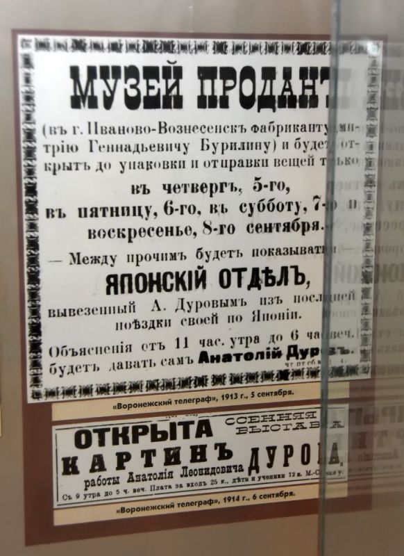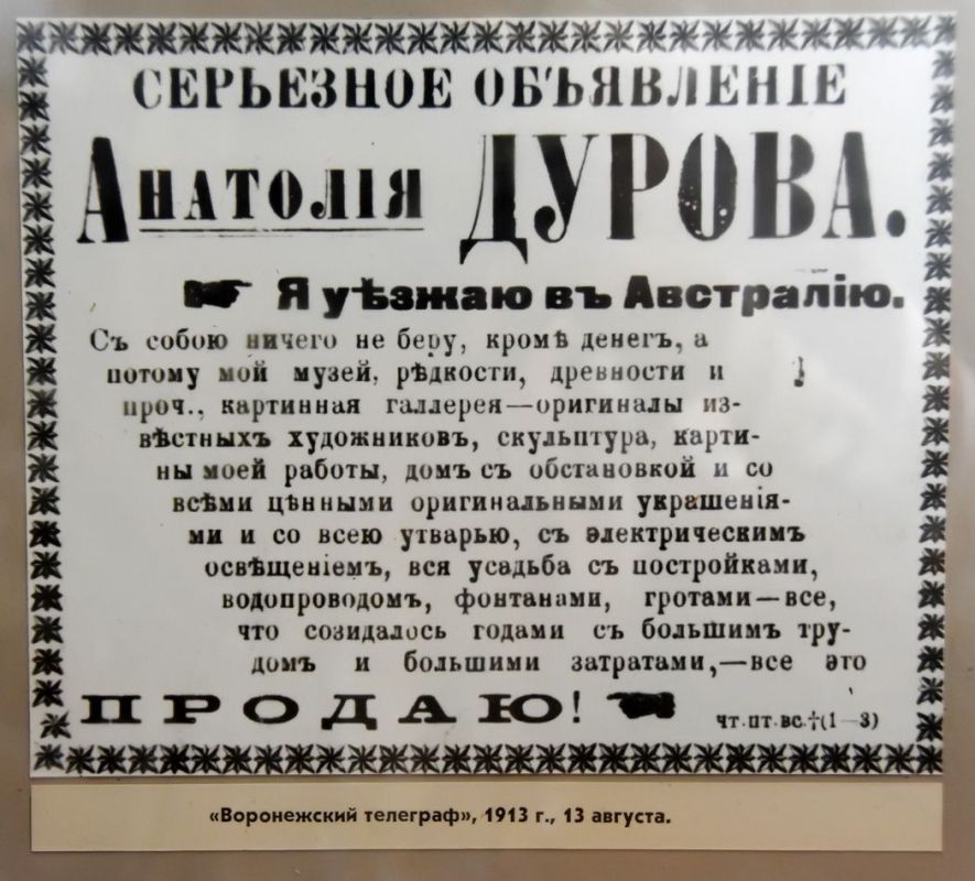 В 1913 году он предложил их Воронежу (деньги были нужны на покупку животных, все погибли в загоревшихся конюшнях цирка в Кишинёве). Но отцы города денег не нашли, и Дуров продал коллекции меценату Бурылину из Иваново-Вознесенска.