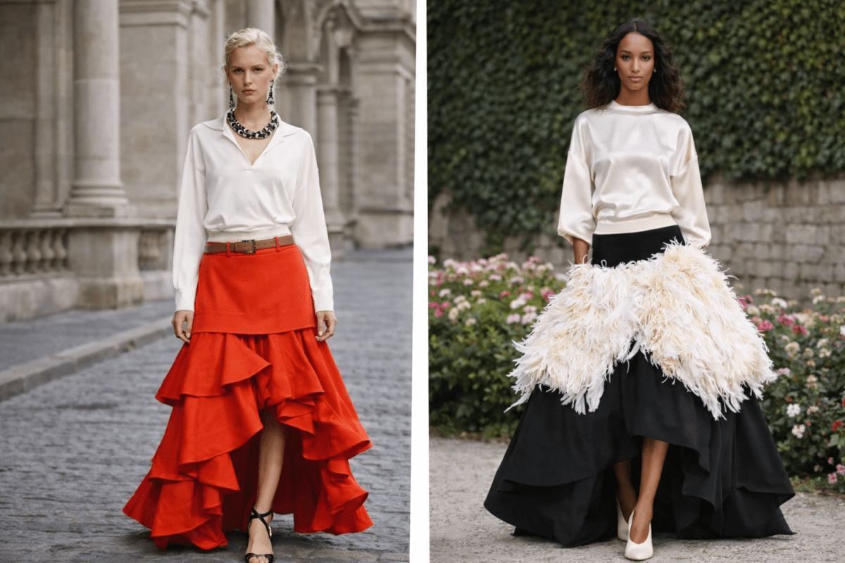 Если раньше внимание притягивал верх, то теперь центр композиции — низ. Юбки становятся выразительными: с перьями, бахромой, пайетками, асимметричным кроем и гипертрофированным объемом.
