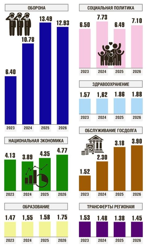 Если сопоставить проекты бюджетов, расходы на образование и социальную политику даже с учётом инфляции на 2026 год планируются в больших объёмах, чем планировались на 2025-й. Например, только на выплату единого пособия для семей с детьми в проект бюджета на 2026 год заложено более 4 триллионов рублей, на программы улучшения жилищных условий семей с детьми — более 2 триллионов, на материнский капитал — порядка 1,8 триллиона.