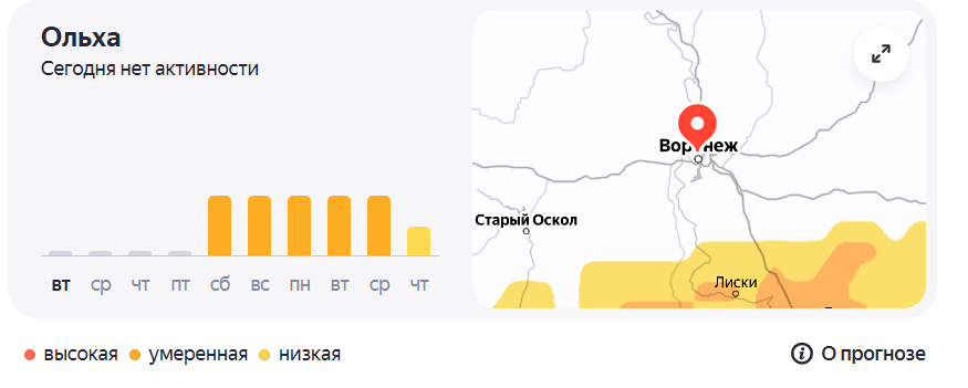 Активность ольхи будет умеренной до среды, 1 апреля, а затем начнёт снижаться.