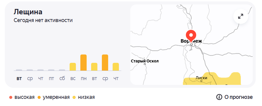 Цветение лещины начнётся с воскресенья, 29 марта. Пыльца будет досаждать аллергикам волнообразно — умеренная активность будет чередоваться с низкой.