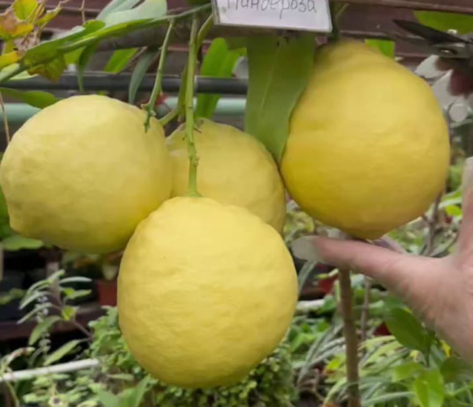 Огромные лимоны относятся к сорту Пандероза. Это неприхотливый гибрид цитрона, грейпфрута и лимона. Его плоды могут весить до килограмма.