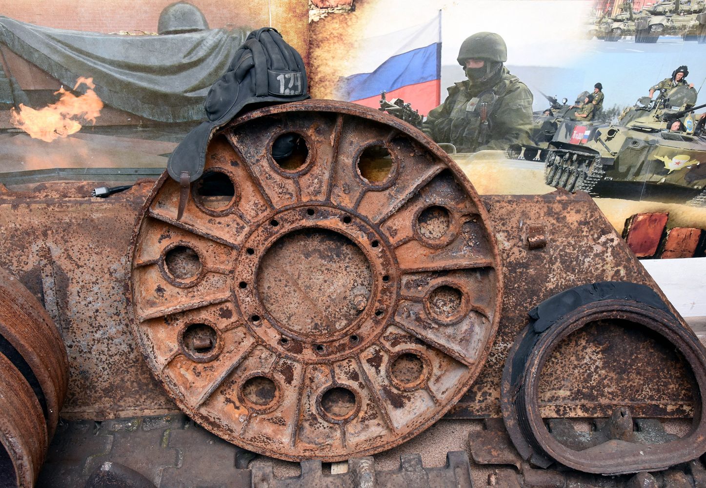 Возле стены — части от разных советских танков, в основном от Т-34: два люка с моторных отсеков, люк от танковой башни «тридцатьчетвёрки», производившейся на Сталинградском тракторном заводе, танковые катки, обнаруженные при раскопках в Рамонском районе в районе Большой Верейки. Рядом — кусок боковой брони длиной 490 сантиметров, найденный в Воронеже на территории бывшего мясокомбината, траки от разных советских танков.