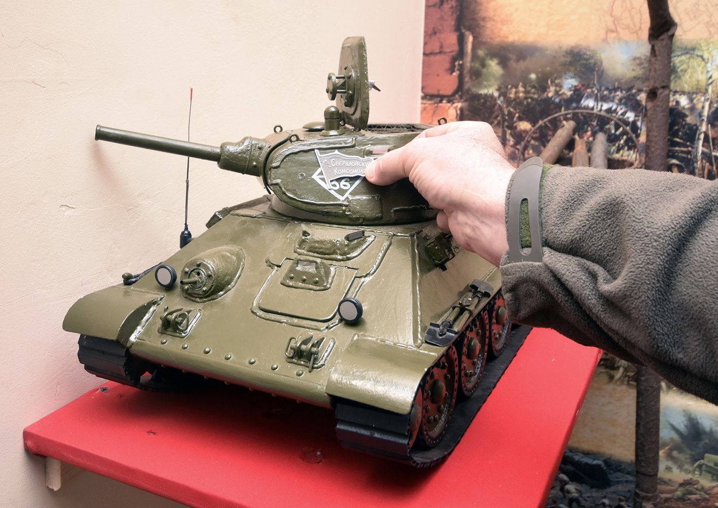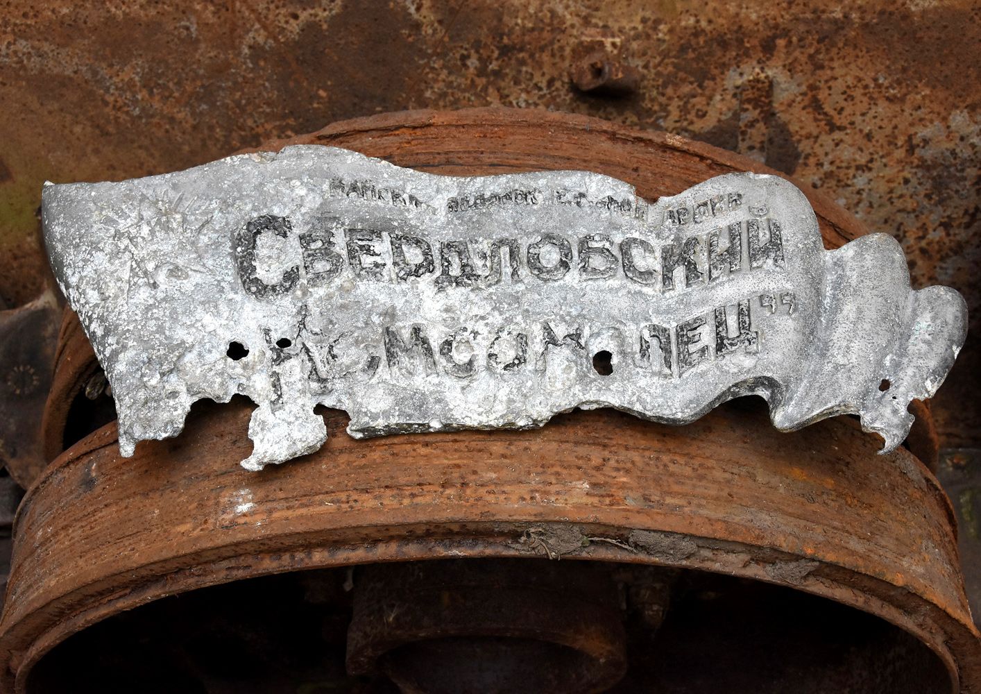 — А вот наш главный экспонат, — показывает Андрей Скалевой, — металлическая табличка (подобные крепились на танковых башнях) в виде знамени с надписью «Свердловский комсомолец — майский подарок Красной армии». И буквы «КИМ» — коммунистический интернационал молодёжи. Комсомольцы Свердловска и Челябинска за годы войны на собранные деньги построили три танковых колонны, одна из которых сражалась в корпусе генерала Лизюкова под Воронежем, табличку нашли недалеко от места его гибели.
