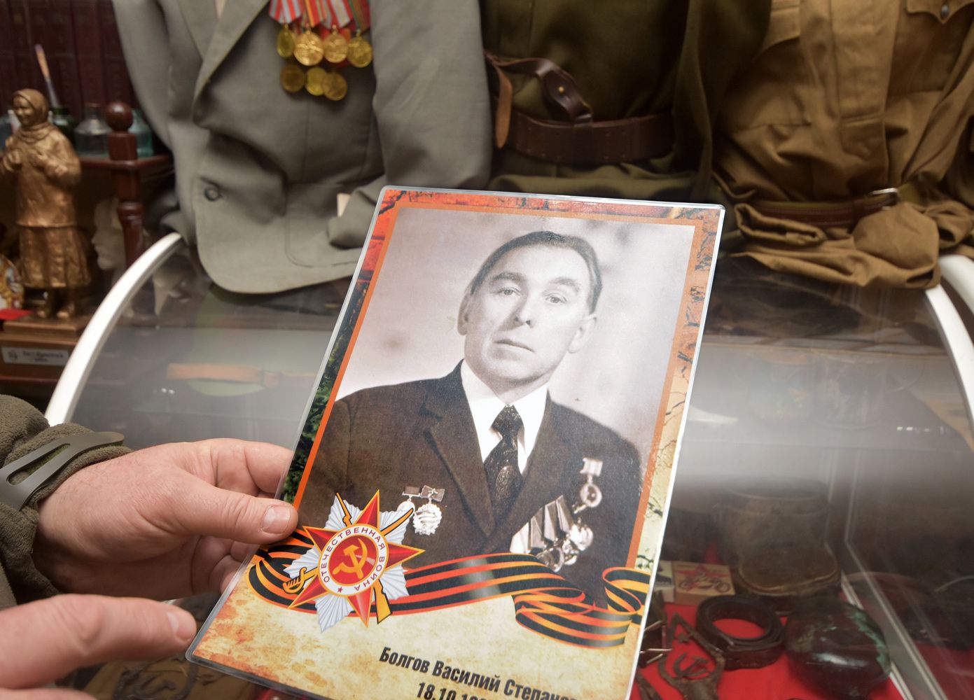 — Эта была обнаружена совсем не на поле сражения. Между Придонским и Подклетным есть карьер, где раньше размещалась свалка. Отец нашего товарища Виктора Иванникова несколько лет назад нашёл там пакет с коробочкой, в которой было 19 различных медалей и орденов, 16 из них принадлежали Василию Степановичу Болгову — уроженцу села Ведуга Семилукского района, родившемуся в 1925-м и умершему в 2003-м. Мы нашли его через военкомат, нам дали телефон родственников, который всё время молчал, и поиски зашли в тупик. Узнали, что Болгов немного воевал на 3-м Белорусском фронте, в 1949-м окончил Киевское пехотное училище, но служить не стал и демобилизовался. Вернулся в родное село, а вскоре выбыл предположительно в Воронеж. Среди его найденных наград было очень много за трудовую деятельность, в том числе орден Знак Почёта — самого его в коробочке не было, только орденская книжка. В одной из них стояла подпись одного из руководителей тогдашнего Министерства нефтяной и газовой промышленности СССР. Стало ясно, этот факт связан с воронежским АО «Воронежсинтезкаучук». Созвонился с ними, там подтвердили, что Василий Болгов долгие годы проработал на предприятии. То есть награды фронтовика нашли не на поле боя, а на свалке. К тому моменту его сына (три из найденных наград принадлежали ему) в живых уже не было. И видимо, кто-то из родни собрал всё это и вынес туда. Недавно мы купили пиджачок времён СССР и нацепили на него часть наград Болгова — военные и гражданские, — рассказал Андрей.