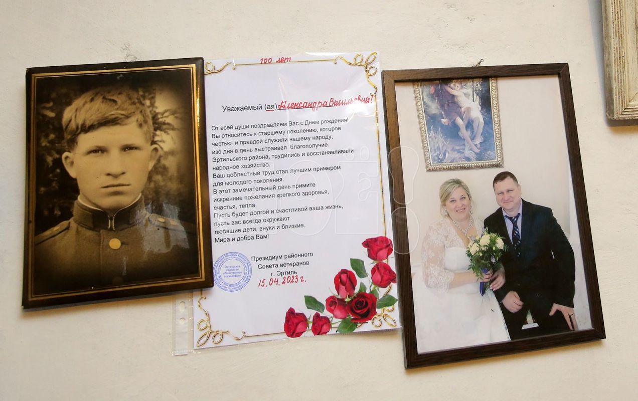 Родовой домик Александры Васильевны, в котором она появилась на свет, где вырастила с мужем детей и где доживает теперь свой век — её отец и мать построили в 1905 году. Он «пустотелый»: то есть стены — два ряда кирпичей, а между ними ничего. Деревянная дверка. В единственной комнатке дощатый пол. В сенцах — гольная земля. Конечно, по молодости Саша с Ваней его перекраивали — пока росли дети, печка была на всю хату, а теперь маленькая, сени тоже меньше стали, и крыша уже не соломенная. Но основе — 118-й год.