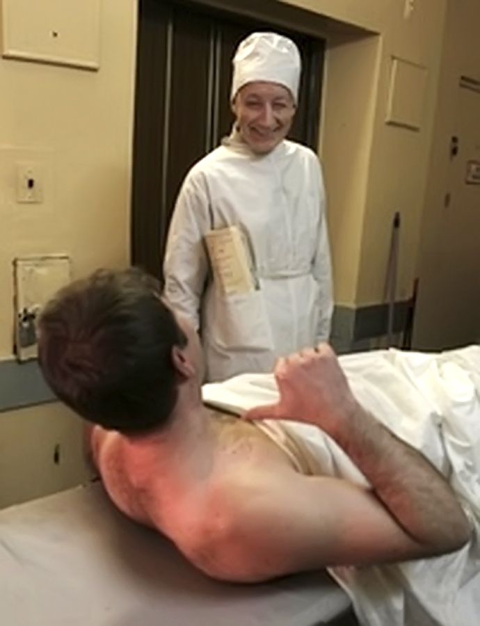 Вскоре присеменил «труп», 30-летний весельчак Лёха. Улёгся на припаркованную у стены каталку. Накрылся простынёй, только ноги торчат. На большом пальце бирочка: «Иванов И.И. 1939 — 1979».