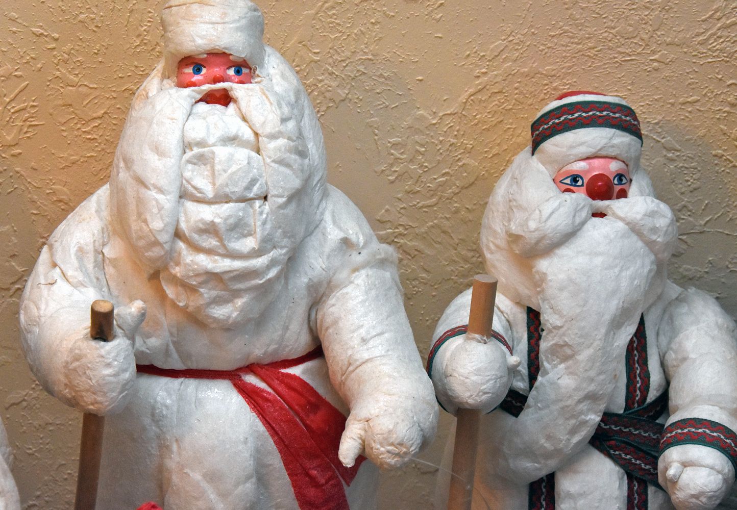 — А вот и наш «алкоголик» с розовым лицом и красным носом, — смеётся хозяин, — тоже, кстати, изготовленный артелью «20 лет РККА». Вот другой похожий, произведённый в Горьком артелью «Детская игрушка» в 1958-м (ныне — Нижний Новгород. — Прим. «Ё!»). Он с палочкой и лично мне напоминает партизана, который вышел из леса, — суровый и бывалый. А вот изготовленный в Бресте в 60-х годах прошлого века, воротник шубы закрывает добрую половину подбородка. Кстати, именно брестских Дедов Морозов можно отличить по выструганному посоху. Мы купили его в путешествии по Золотому кольцу, когда ездили в Суздаль и Владимир. Он был покрыт слоем пыли, стоял, видно, много лет на витрине антикварного магазина.