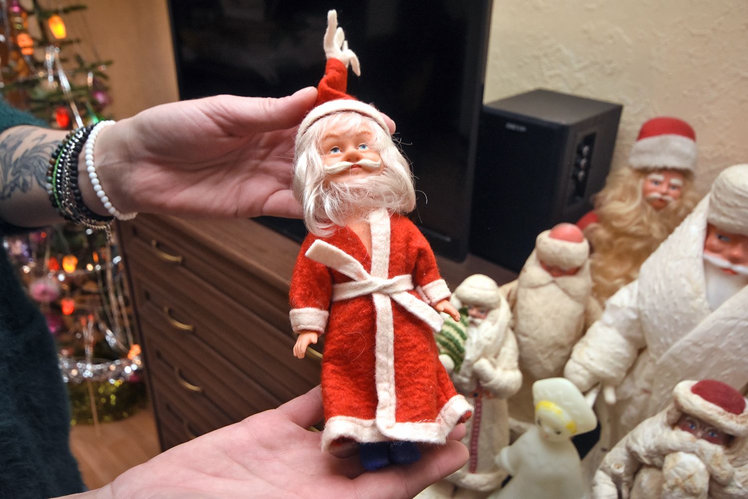 — Конечно, они одушевлённые и знают, как согреть любой дом, принести в него уют и порадовать хозяев. А характер у всех разный, как у людей. Мечтаю хоть краем глаза взглянуть на первые ёлочные игрушки воронежского производства, которые ещё до войны делались в Воронеже артелью «Культпром». Конечно, ближе к 90-м годам они выполнялись уже из разного материала. Если в 50 — 60-х это была вата, потом появились деревянные, пластмассовые, резиновые, просто в виде мягких игрушек, пенопластовые. А вот, кстати, мраморный светильник в виде Деда Мороза примерно 80-х годов прошлого века. Через несколько дней поставим дома живую ель до потолка, под ней наверняка будет стоять мой Дед Мороз из детства. Главное, чтобы наш кот Виктор не навёл там свой порядок!