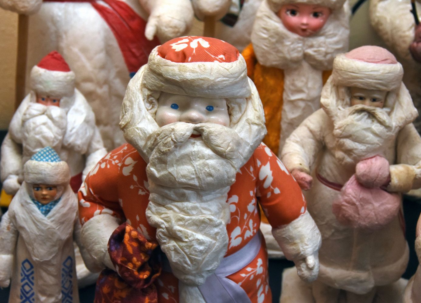 — Самые большие их фигурки, известные нам, в высоту достигающие 70 сантиметров, делались в своё время на теребовленской фабрике (Тернопольская область УССР. — Прим. «Ё!»). Дед Мороз и Снегурочка этой фабрики, кстати, засветились в фильме «Чародеи», когда Камнеедов несёт в двух руках теребовленских Деда Мороза и Снегурочку. А вот этот, почти полуметровый, сделан в Донецке в 1970 году. Примечательно, что ранние дедушки шли в красной шубе, а синяя шуба — уже более поздние модели. Отличительная черта этих Морозов — шуба, сшитая из ткани, — поясняет Евгений. — А вот мультяшный Дед Мороз — щекастый и плутоватый — из Ярославля 80-х годов, ничего подобного нигде никто не делал. Основные города СССР, где производились Деды Морозы, — это Воронеж, Ярославль, Калинин, Ленинград, Киев, Брест, Донецк, Теребовля, Москва.