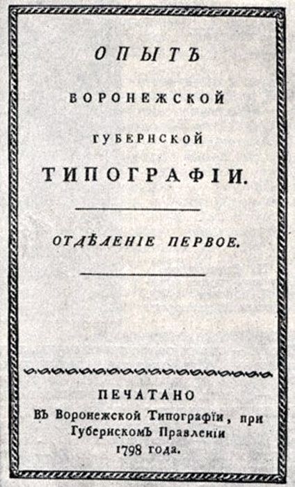 В 1798 году в Воронеже по инициативе Болховитинова и его единомышленников была открыта первая в Воронеже типография (на нынешней улице Сакко и Ванцетти, здание не сохранилось). Первой книгой, напечатанный в ней, стал сборник поэтических произведений, правда, назывался он не совсем поэтично — «Опыт Воронежской губернской типографии». В 1800-м здесь напечатали один из важнейших трудов Болховитинова — «Историческое, географическое и экономическое описание Воронежской губернии, собранное из истории, архивных записок и сказаний», где Евфимий Алексеевич проявил себя как летописец, географ, экономист, статистик и бытоописатель. «Сущность истории, — говорил Болховитинов, — состоит в том, чтобы представить бытие и деяния сколь можно так, как они были, и в таком порядке, как они были».