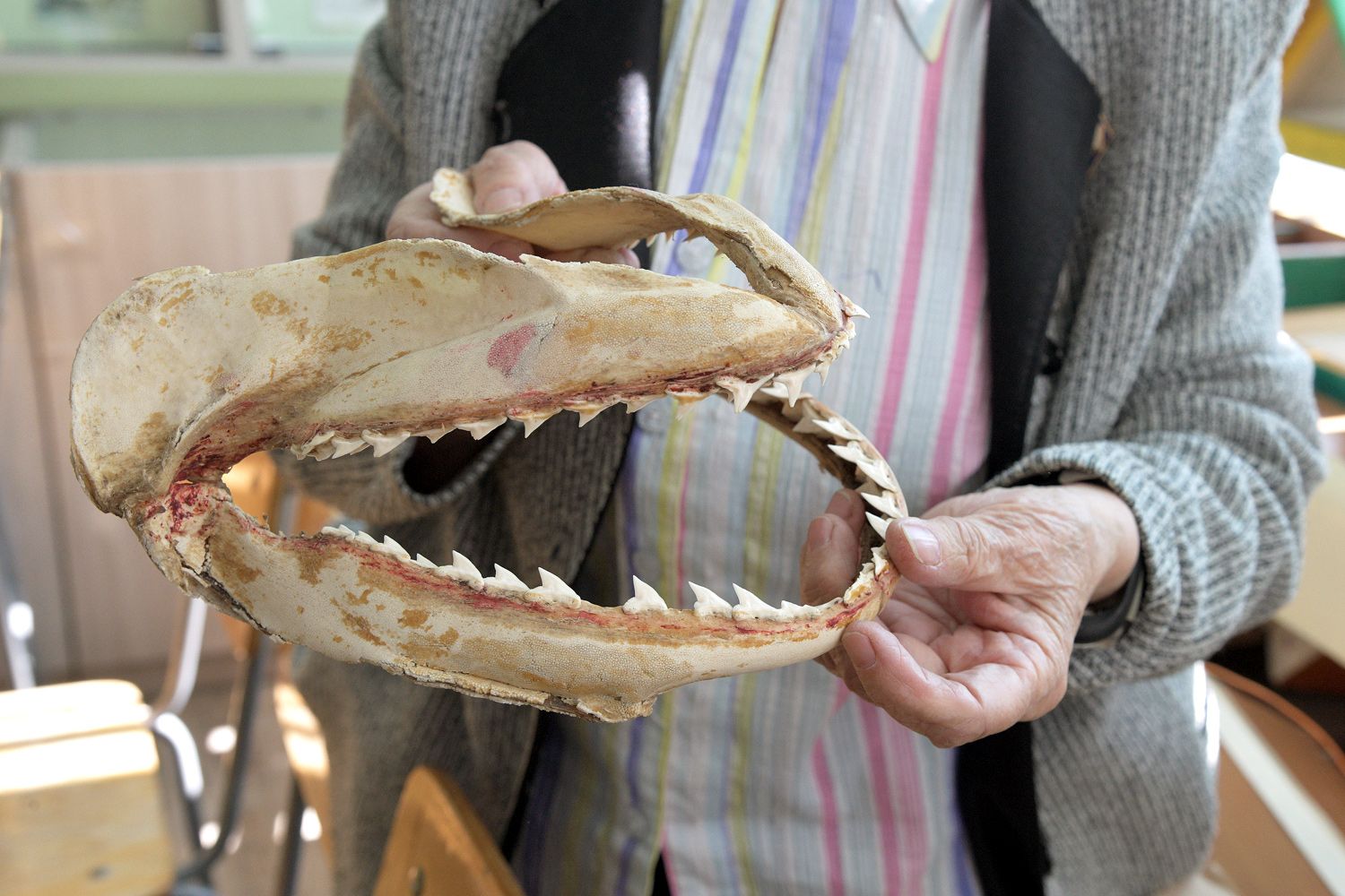 — Это уже не из походов. Ученик мой стал моряком. Они ловили рыбу на траулере. И попалась им в сети акула. Вспороли брюхо, а там малыш — она же живородящая. Вот это челюсть того акулёнка, ещё не рождённого. Зубы у акулы растут всю жизнь. Тут их огромное количество, мы даже считать не стали, — рассказывает она.