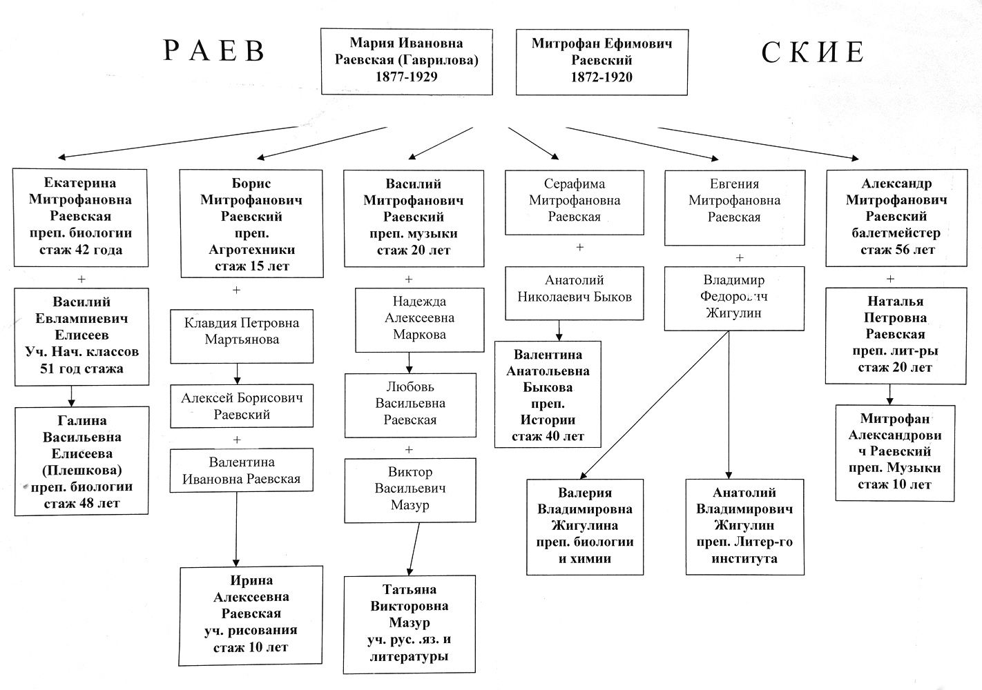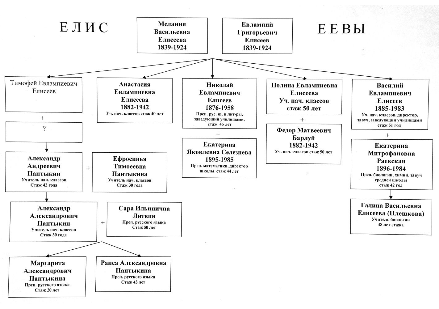 Только по маминой линии — Раевских — больше двух десятков ответвлений с педагогическими веточками. А по линии папы — Елисеевых — четырнадцать. Обо всех членах её семьи в газете не расскажешь — получилась бы сага о Форсайтах. Да что там, даже о родителях придётся «галопом по Европам».