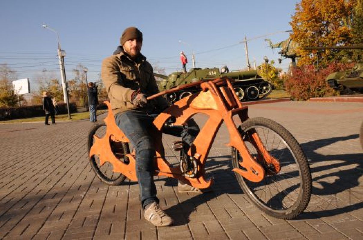 Буквально чуть больше месяца назад Михаил решил воплотить в жизнь давнюю задумку — сделать деревянный велосипед. Вместе с друзьями он открыл веломастерскую в одном из гаражных кооперативов города и приступил к воплощению идеи. В качестве материала использовалась фанера, только некоторые механизмы остались не деревянными — колёса, тормоза.